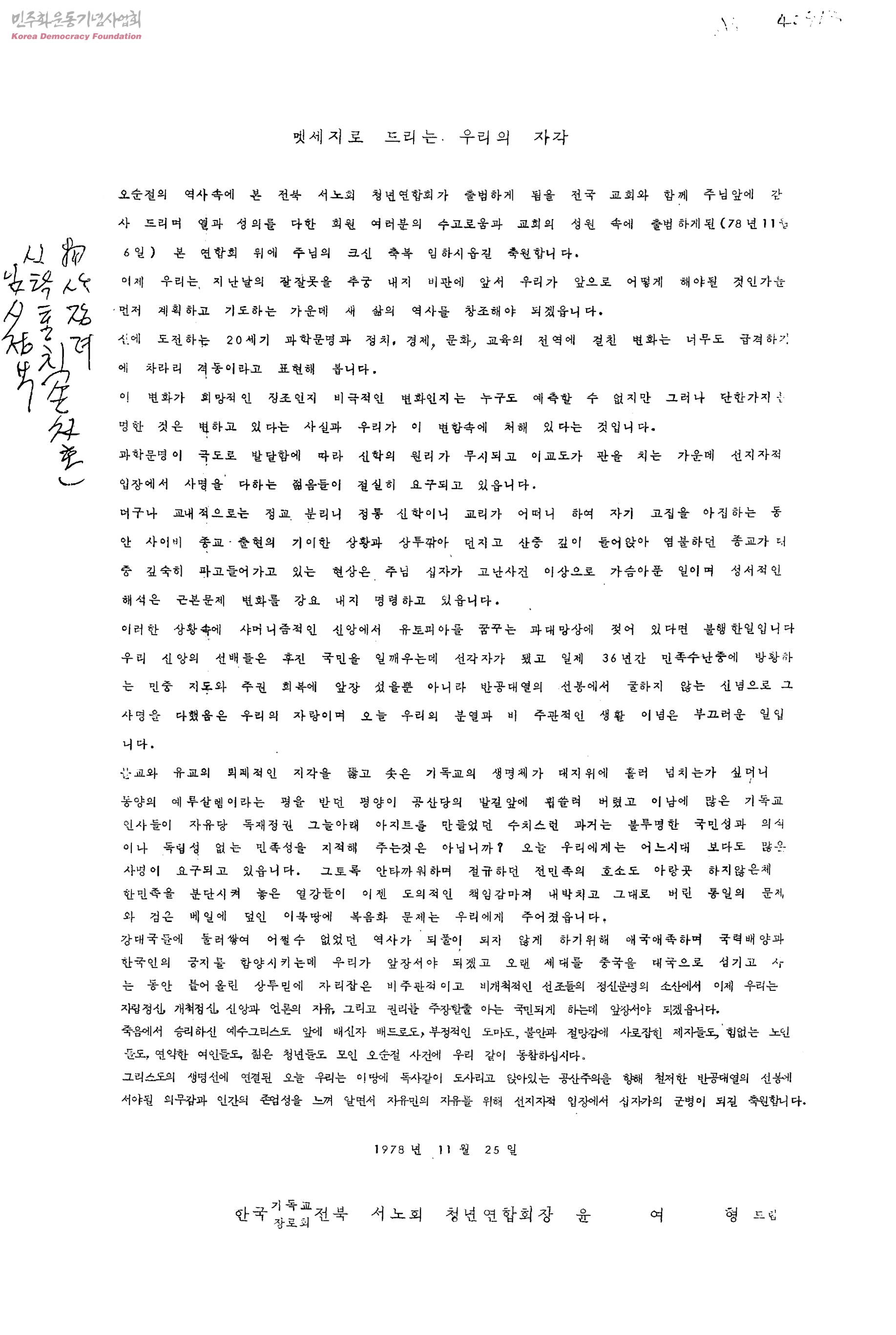 - 한국기독교장로회 전북 서노회 청년연합회장 윤여형