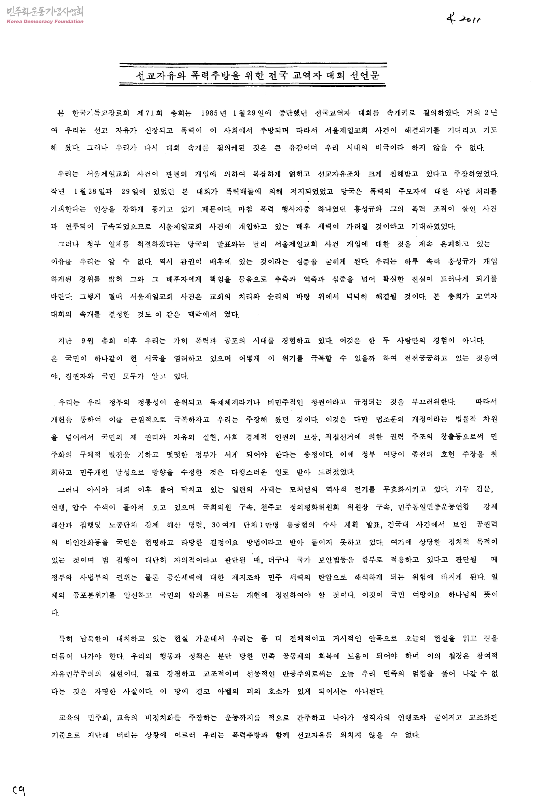 선교자유와 폭력추방을 위한 전국 교역자 대회 선언문
