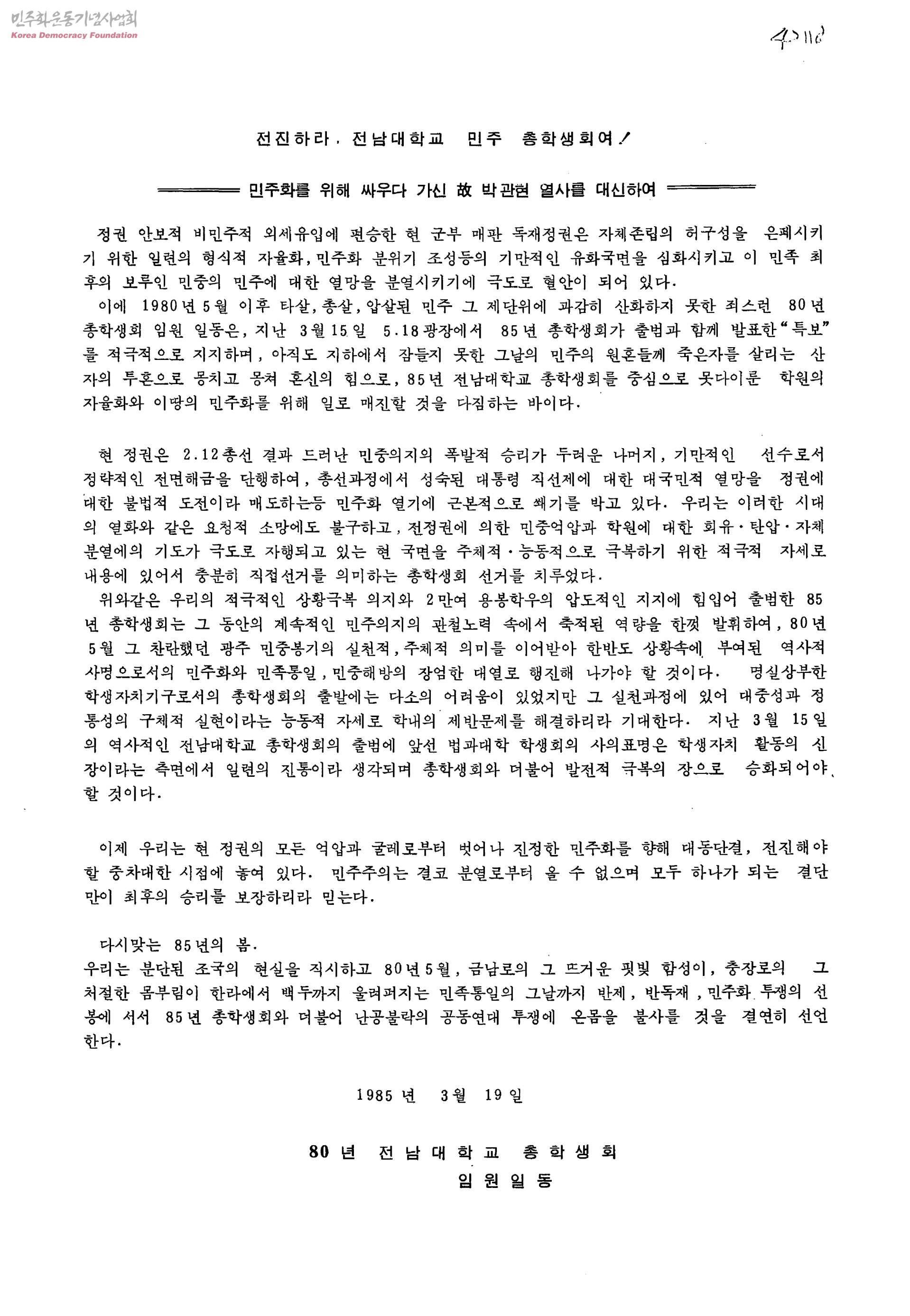 전진하라. 전남대학교 민주 총학생회여! - 민주화를 위해 싸우다 가신 故 박관현 열사를 대신하여