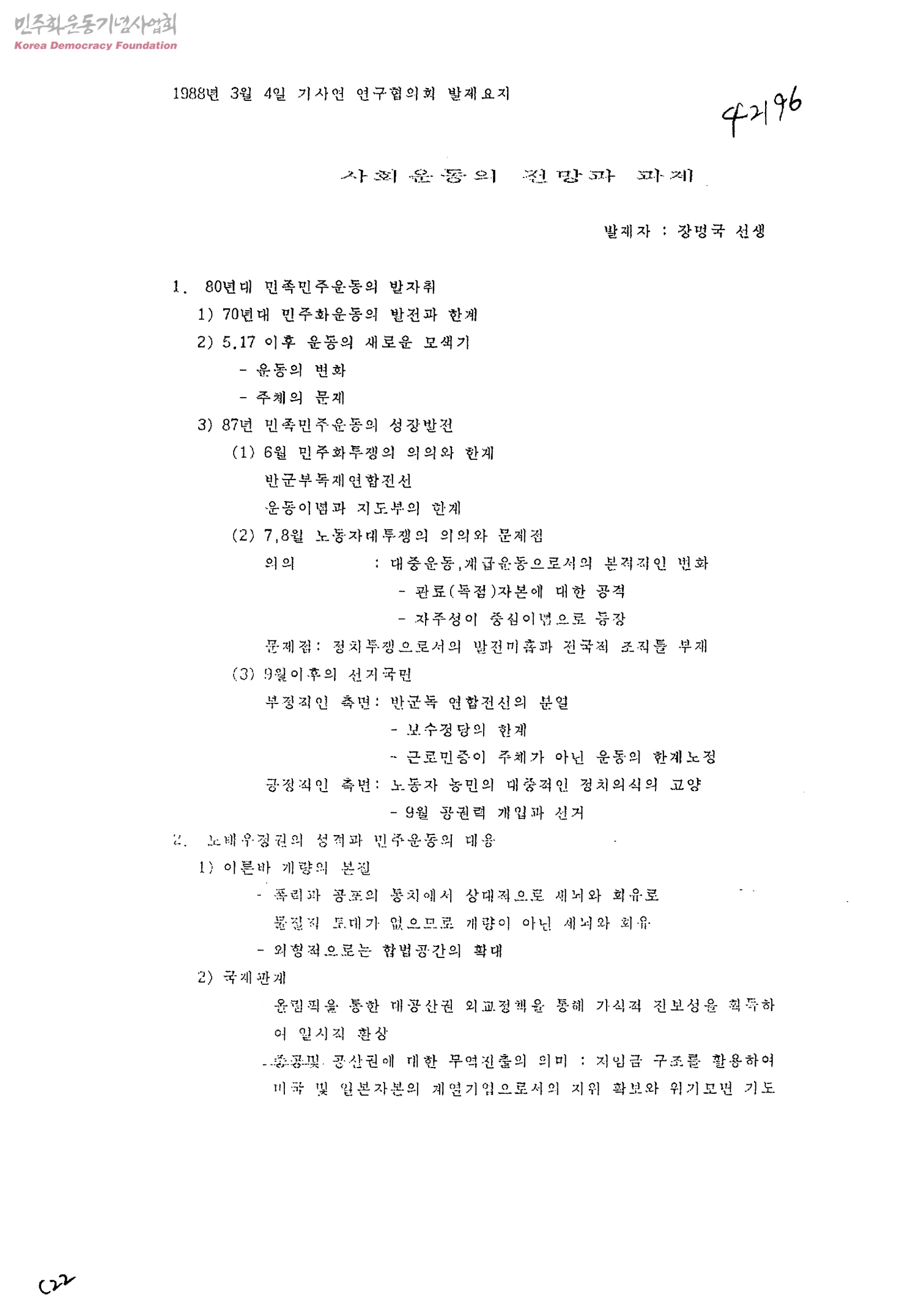 1988년 3월 4일 기사연 연구협의회 발제요지-사회운동의 전망과 과제(발제자:장명국)