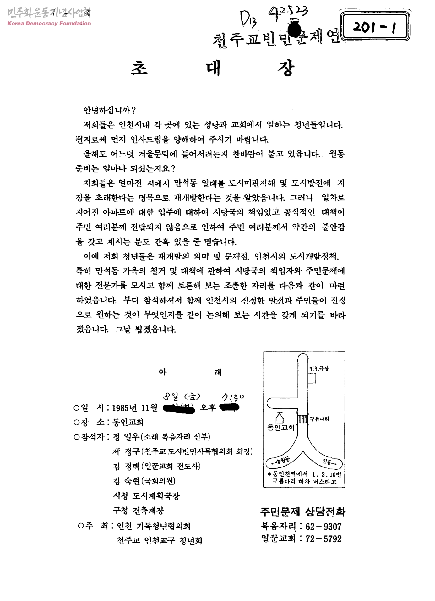 초대장[재개발의 의미 및 문제점, 인천시의 도시개발정책, 만석동 가옥 철거 및 대책에 관한 토론회]