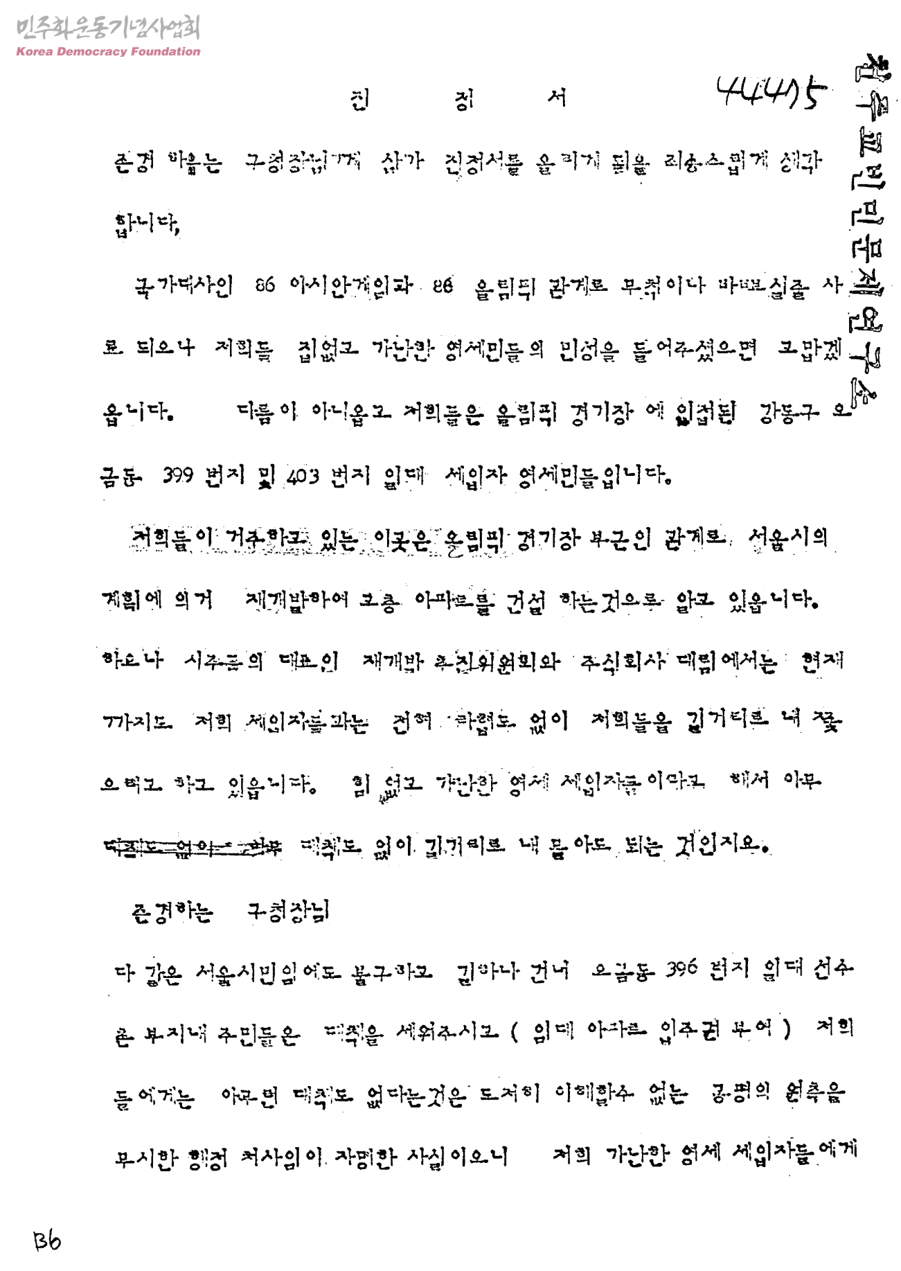진정서[수신:강동구청장, 발신:서울시 강동구 오금동 403-60호(13통 2반) 오금동 철거지역 세입자 김용순 외 312명]