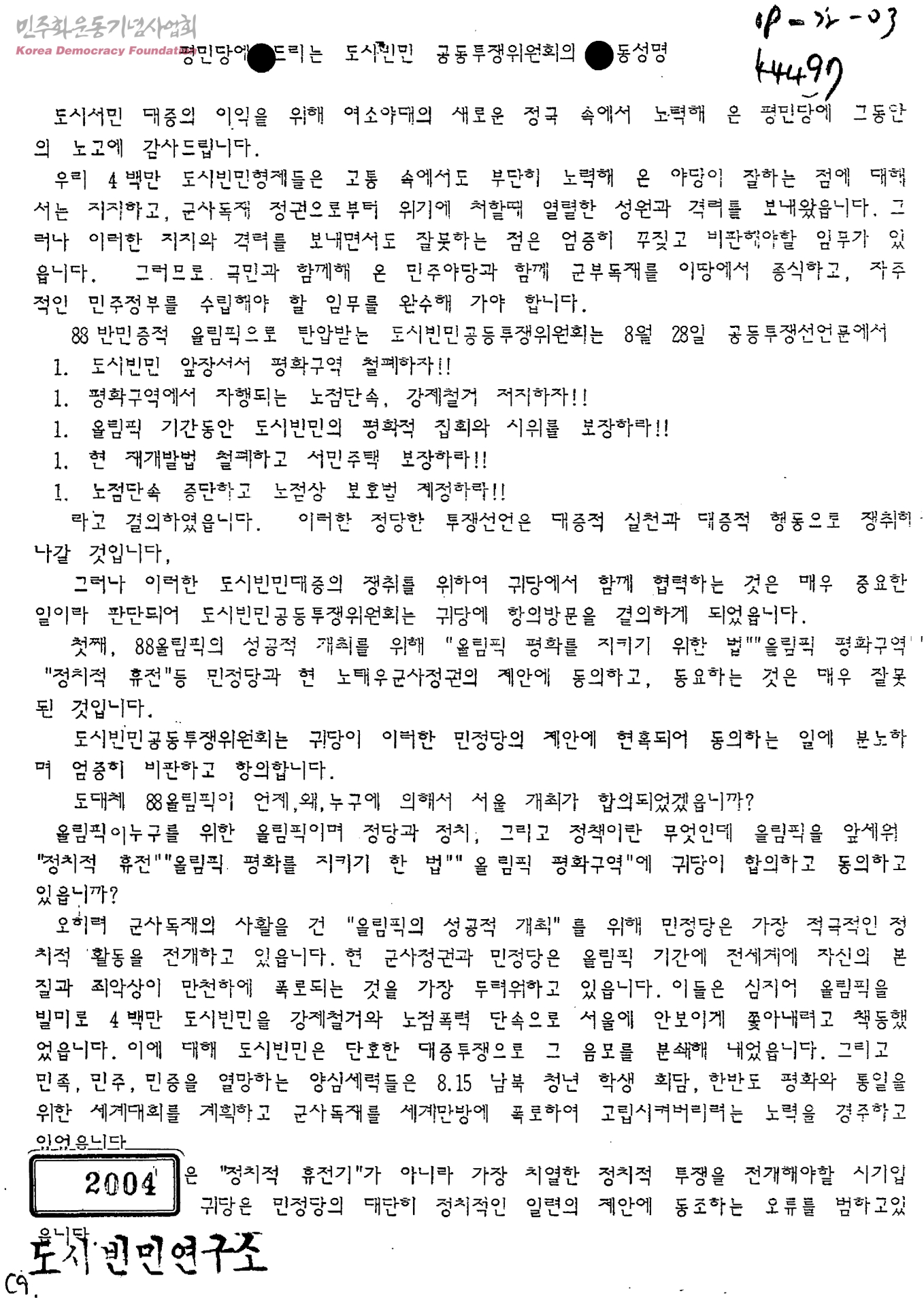 평민당에 드리는 도시빈민 공동투쟁위원회의 공동성명