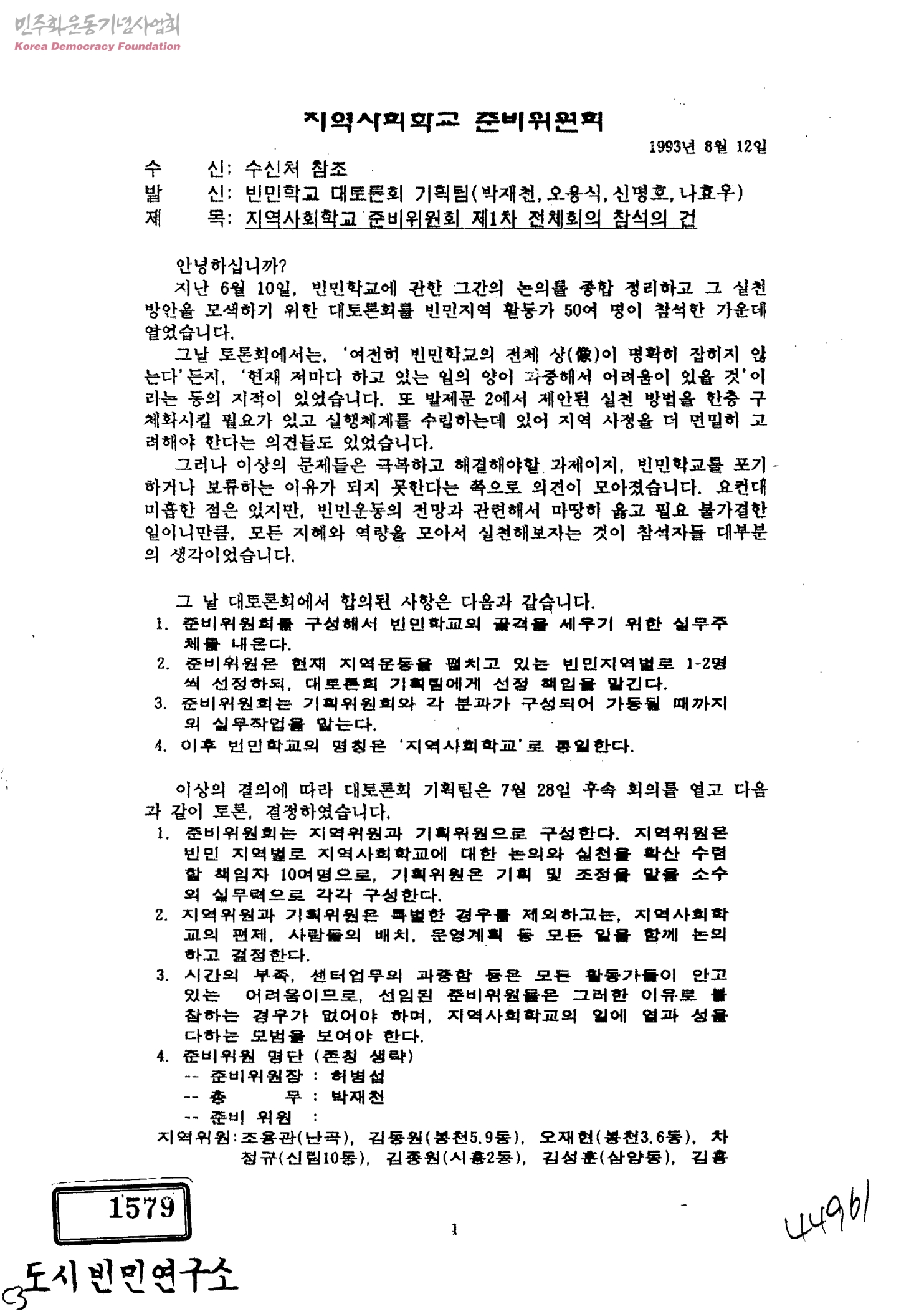 지역사회학교 준비위원회 제1차 전체회의 참석의 건