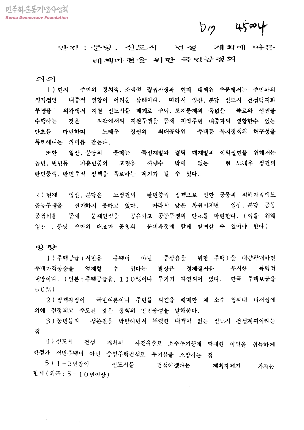 안건 : 분당, 신도시 건설 계획에 따른 대책마련을 위한 국민공청회