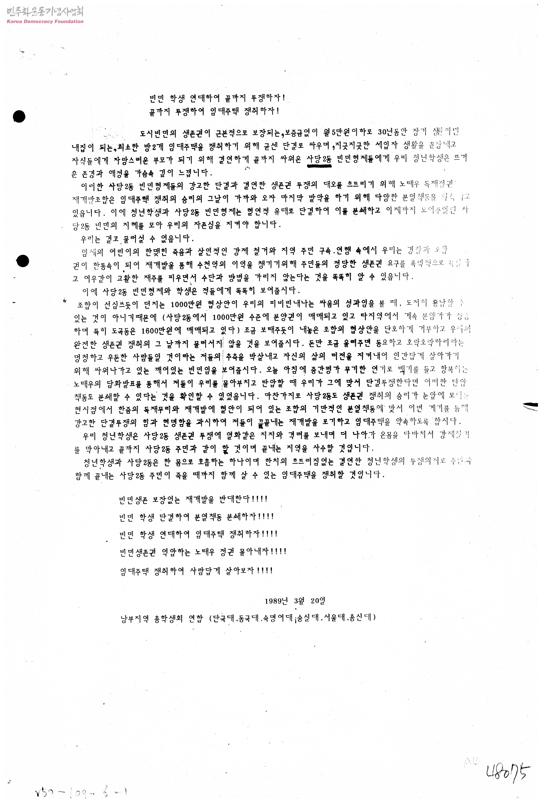 빈민학생 연대하여 끝까지 투쟁하자! 끝까지 투쟁하여 임대주택 쟁취하자!