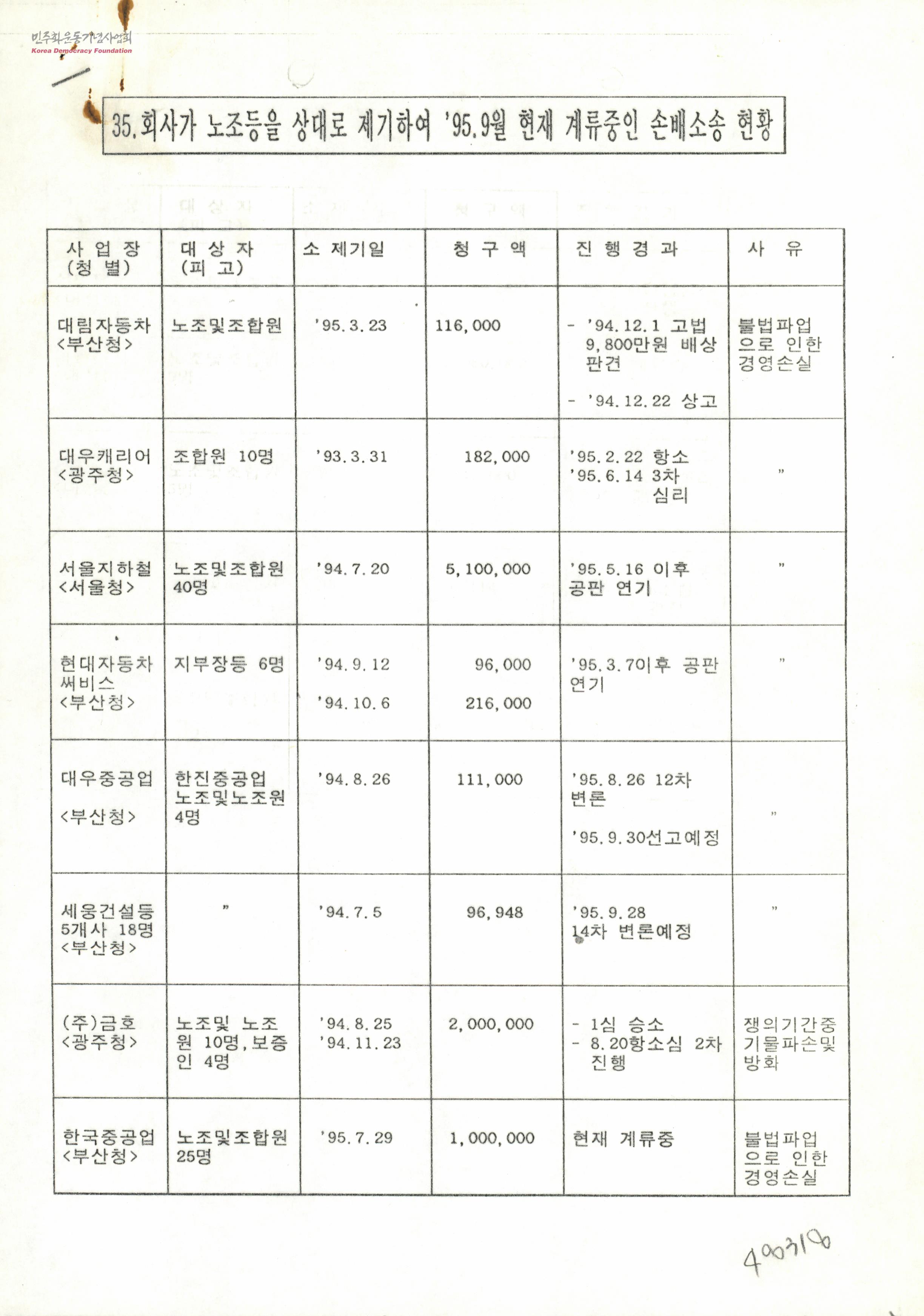[노조원에 관한 사업자의 손해배상 청구 소송에 관한 문서]