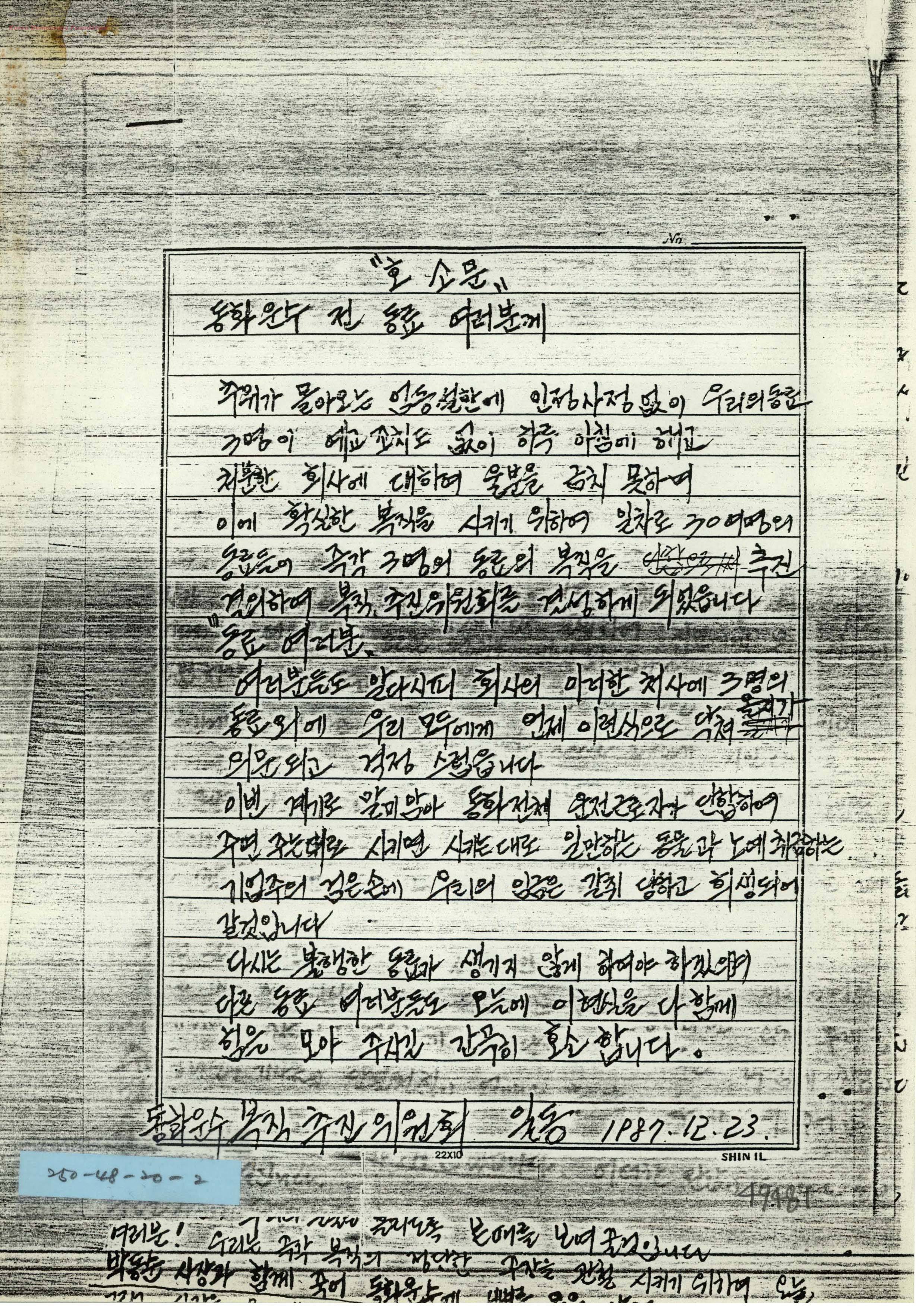 - 부당해고 당한 3명의 조합원의 복직추진위원회 결성 소식과 경영주와 사측에 대한 규탄 등의 내용