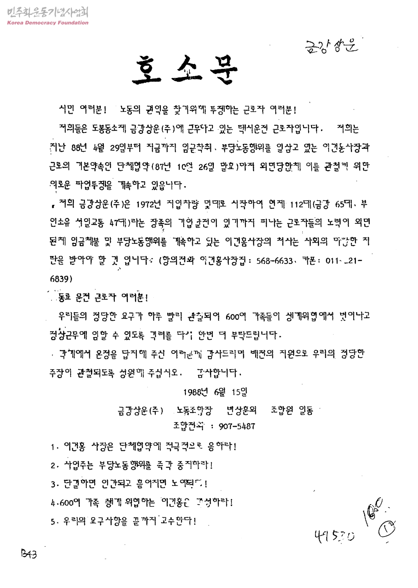 호소문[금강상운 이건홍사장의 임금채불 및 부당노동행위 관련]