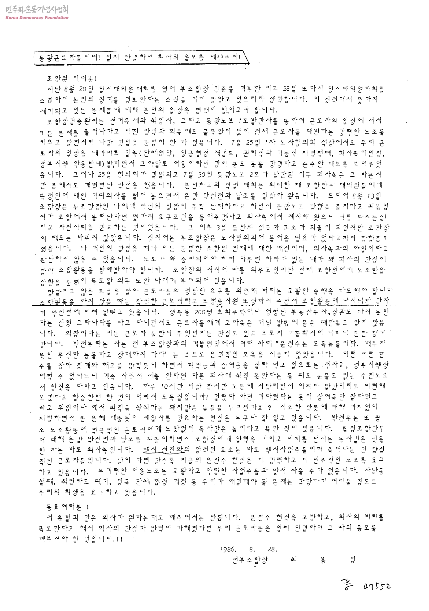 동광근로자들이여! 일치 단결하여 회사의 음모를 깨부수자