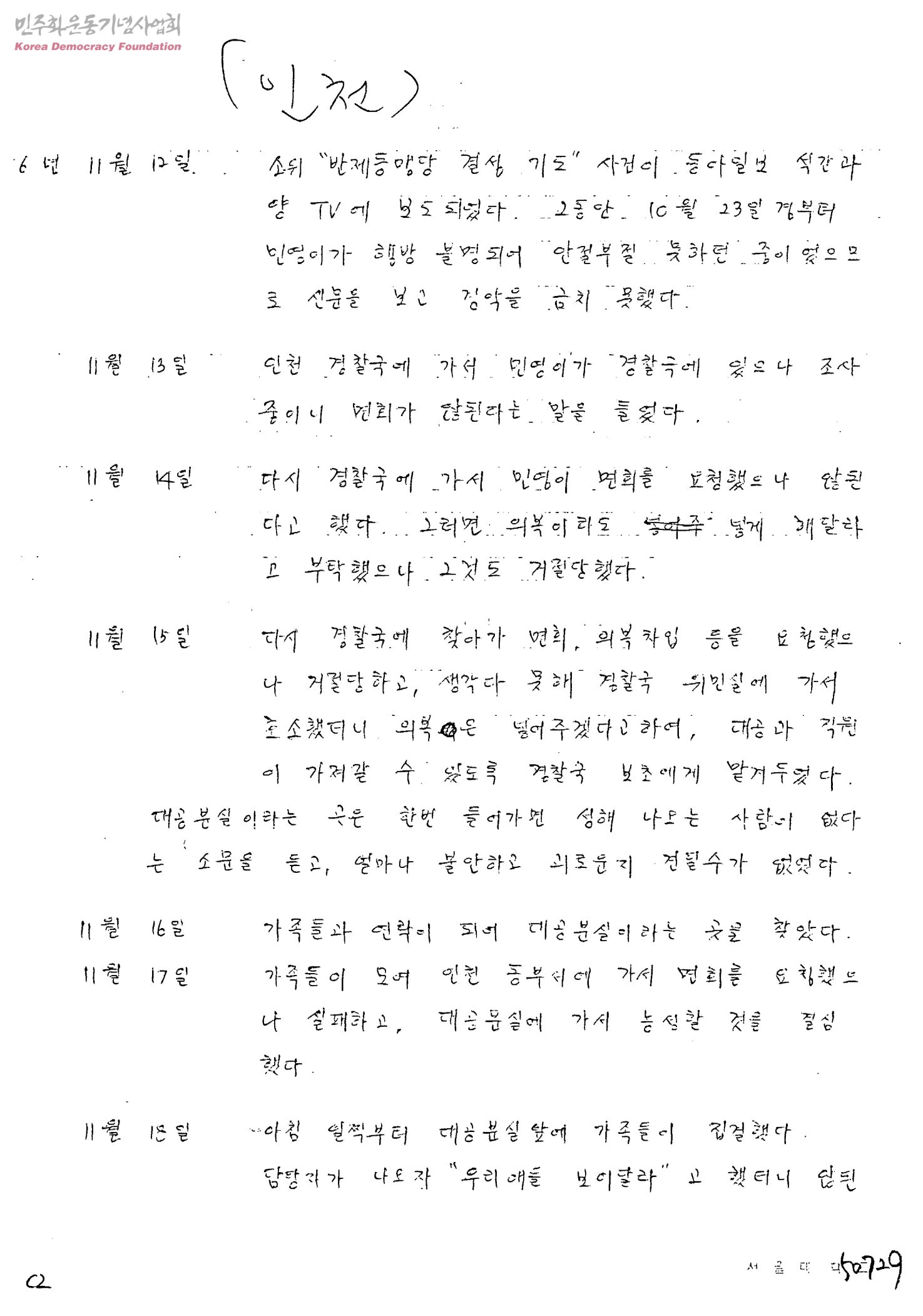 [반제동맹당 결성기도 사건 구속자 중 이민영의 면회 일지]