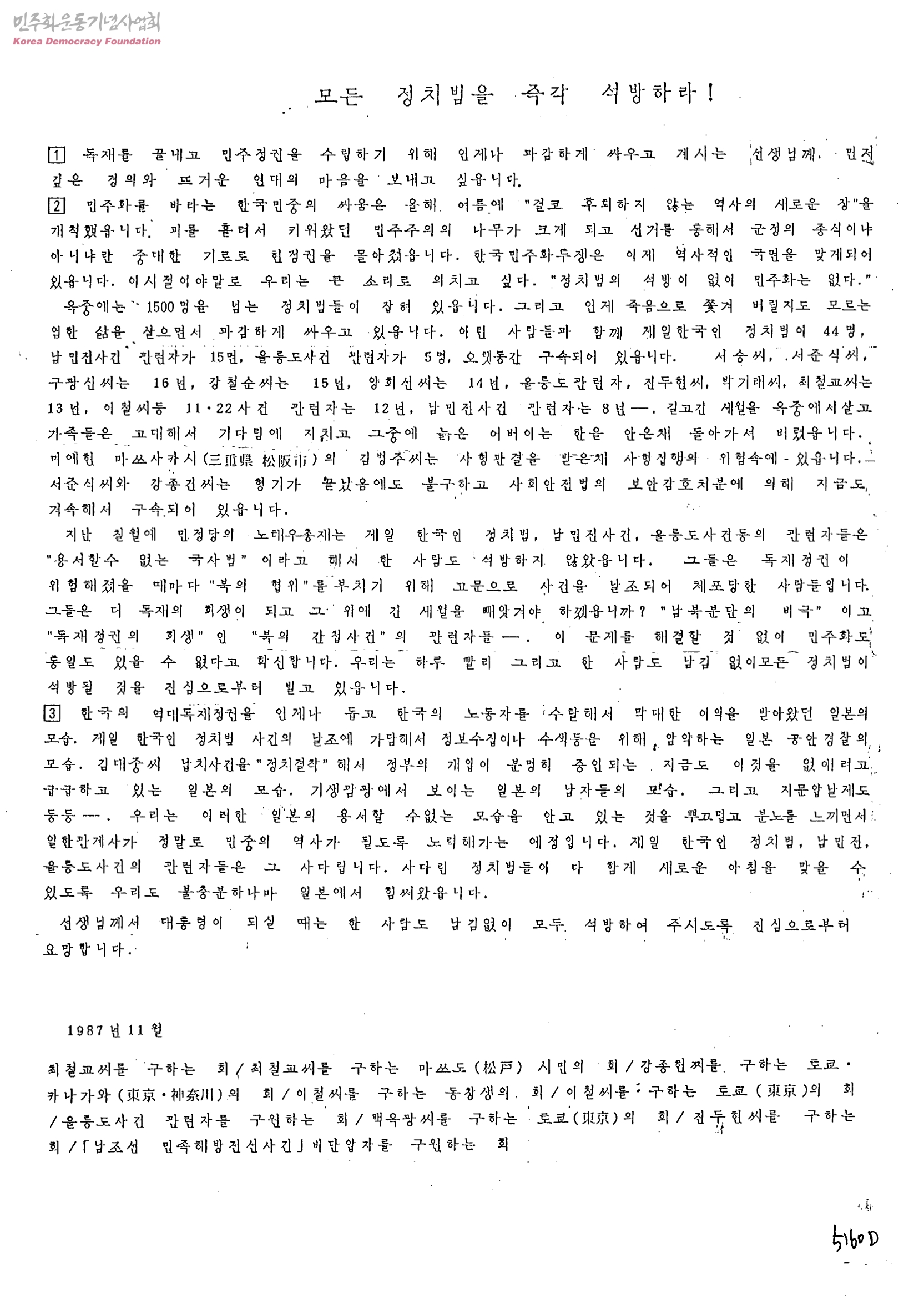 - 최철교씨를구하는회, 최철교씨를구하는마쓰도시민의힘, 강종헌씨를구하는도교카나가와의회, 이철씨를구하는동창생의회, 이철씨를구하는도쿄의회, 울릉도사건관련자를구원하는회, 백옥광씨를구하는도쿄의회, 진두현씨를구하는회, 남조선민족해방전선사건비탄압자를구원하는회