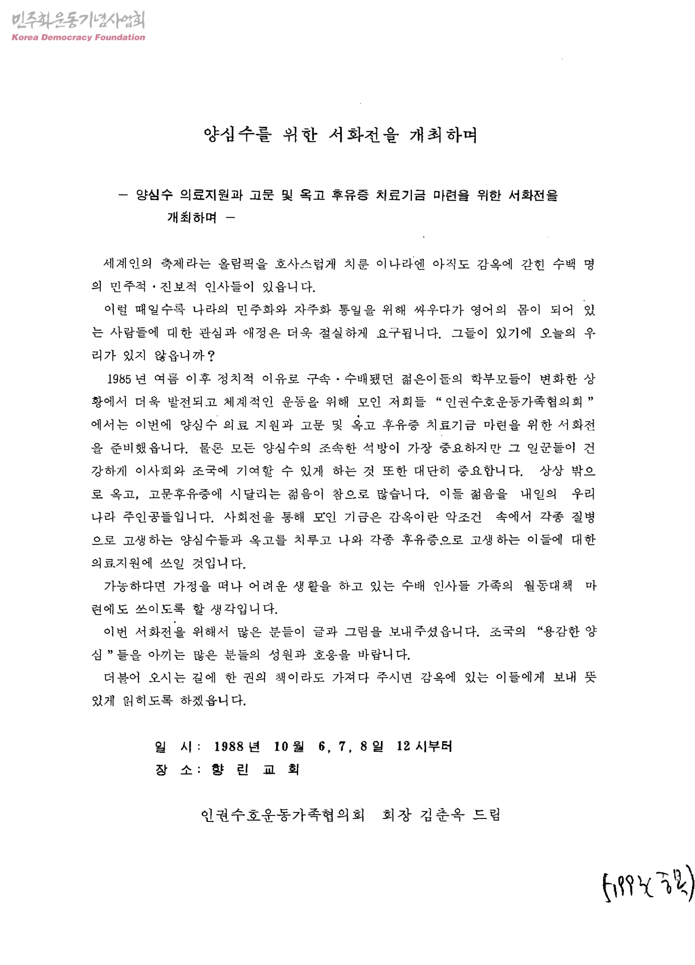 양심수를 위한 서화전을 개최하며-양심수 의료지원과 고문 및 옥고 후유증 치료기금 마련을 위한 서화전을 개최하며
