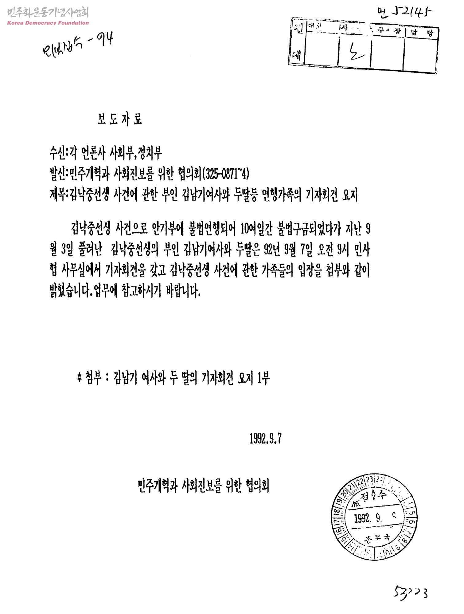 보도자료-김낙중선생 사건에 관한 부인 김남기여사와 두 딸 등 연행가족의 기자회견 요지[수신:각 언론사 사회부, 정치부, 발신:민주개혁과사회진보를위한협의회]