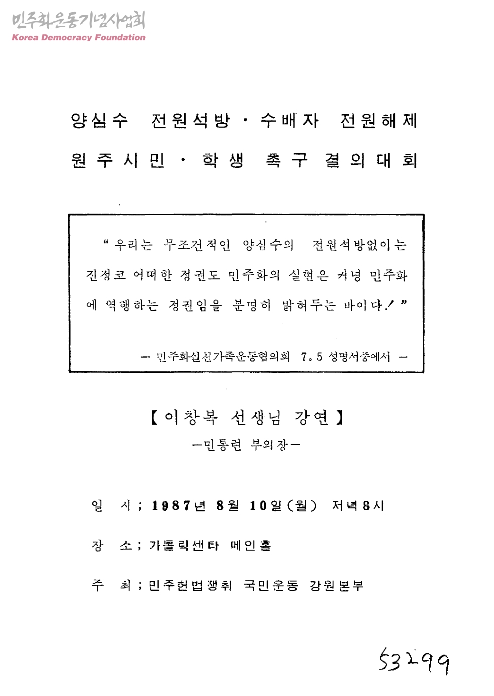 양심수 전원석방. 수배자 전원해제 원주시민.학생 촉구 결의대회