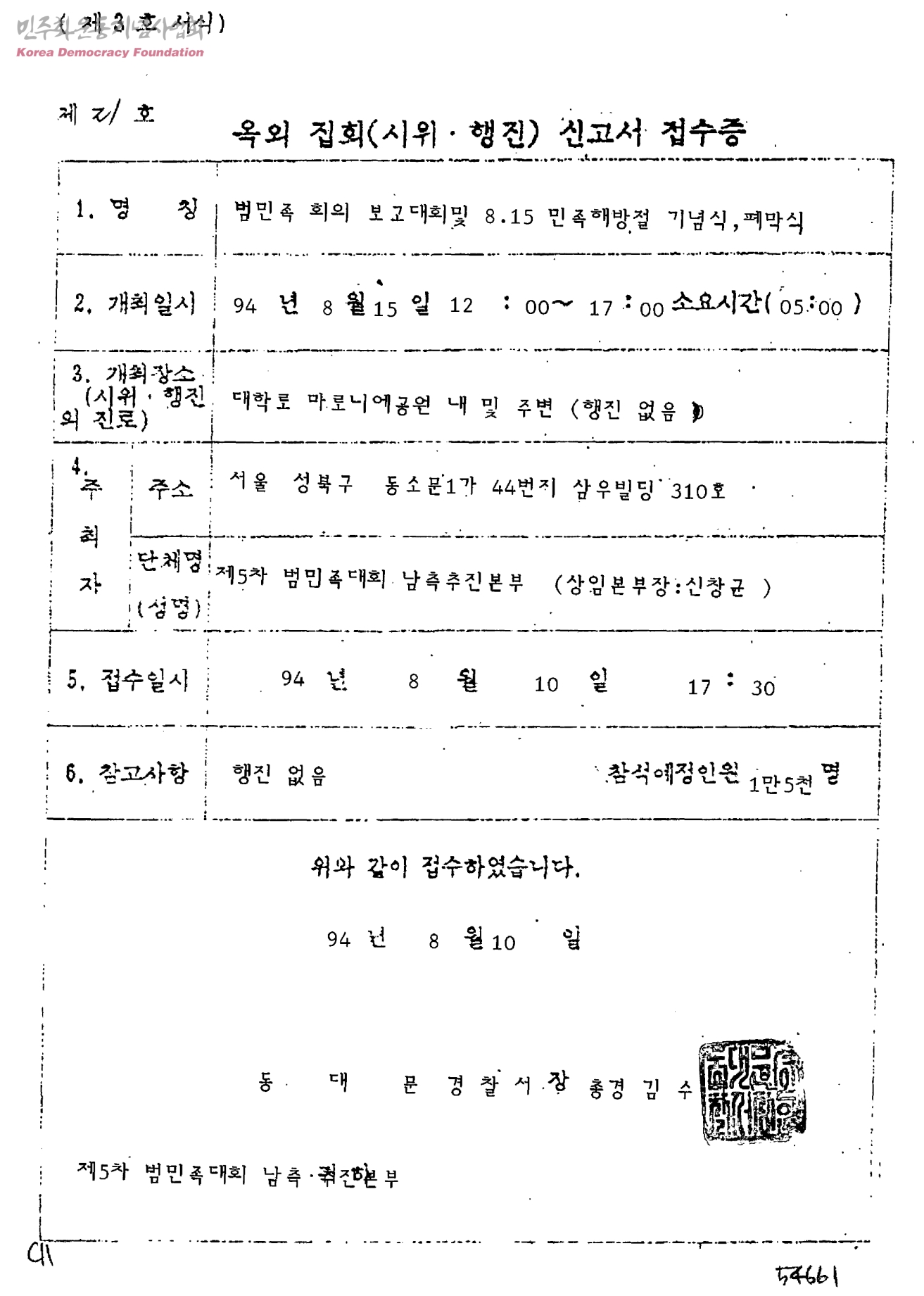 옥외 집회(시위ㆍ행진) 신고서 접수증-범민족 회의 보고대회및 8.15 민족해방절 기념식, 폐막식