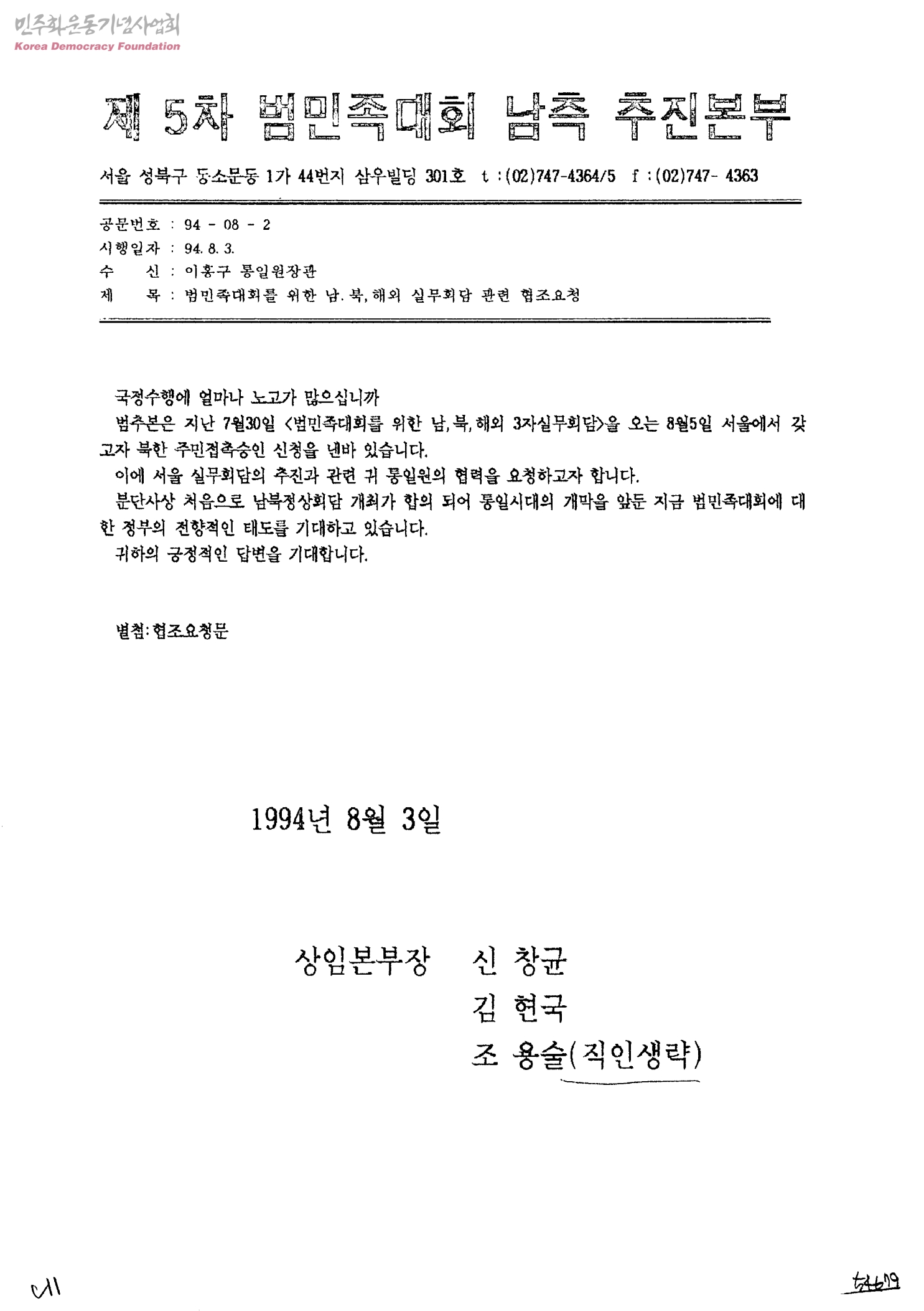 범민족대회를 위한 남, 북, 해외 실무회담 관련 협조요청[수신:이흥구 통일원장관, 발신:제5차 범민족대회 남측추진본부 상임본부장]