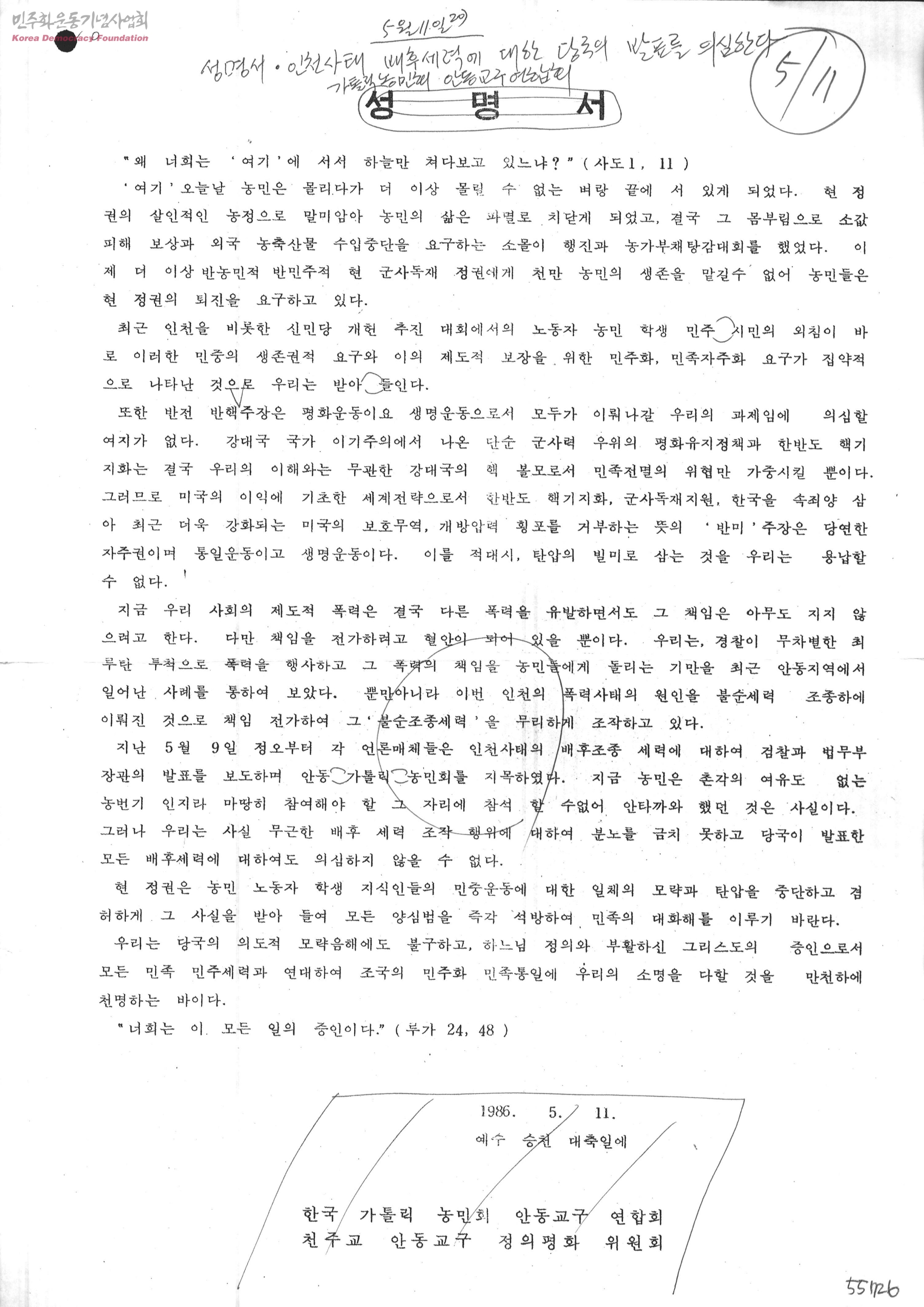 성명서[인천사태 배후세력에 대한 당국의 발표를 의심한다]