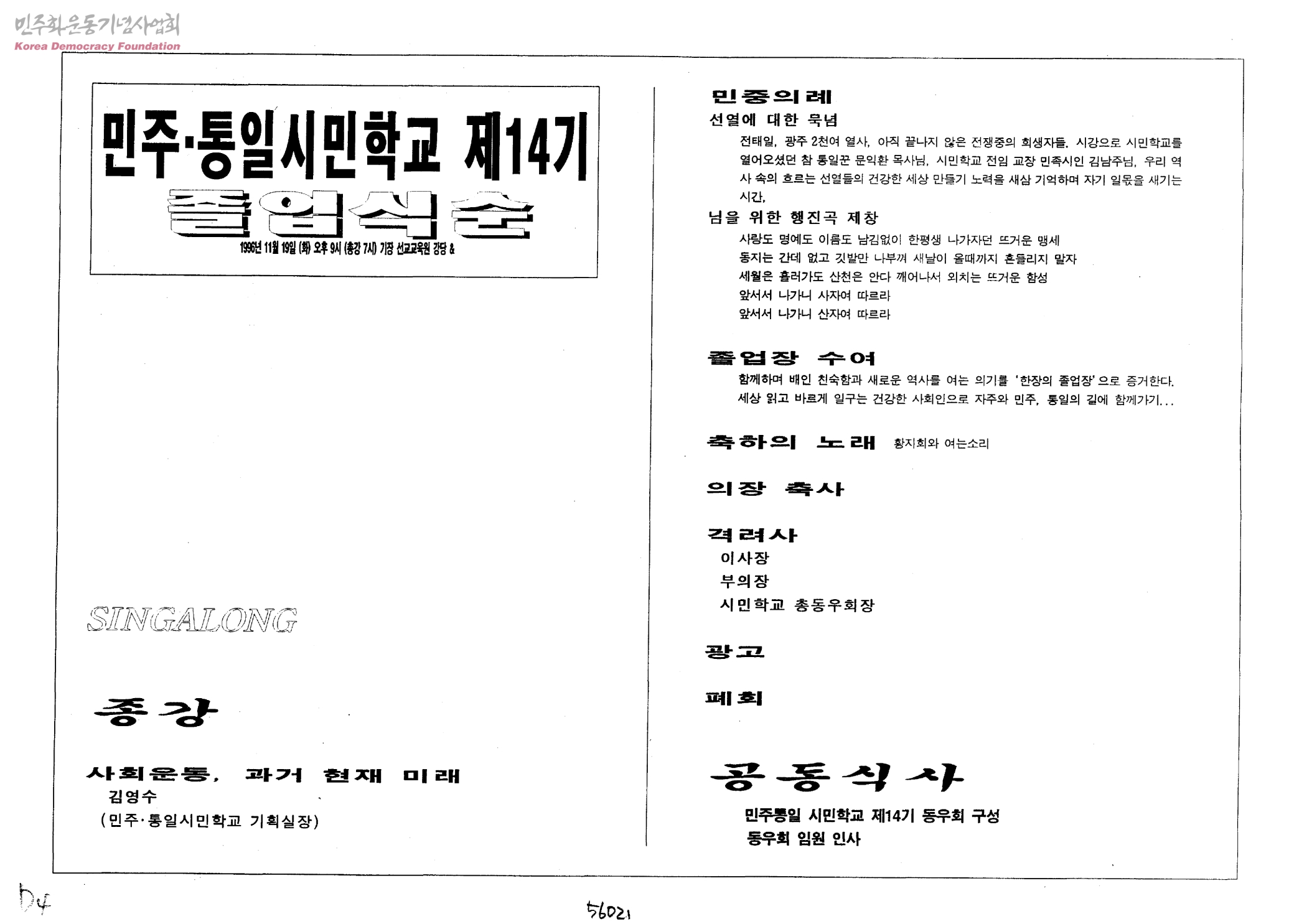 민주ㆍ통일시민학교 제14기 졸업식순