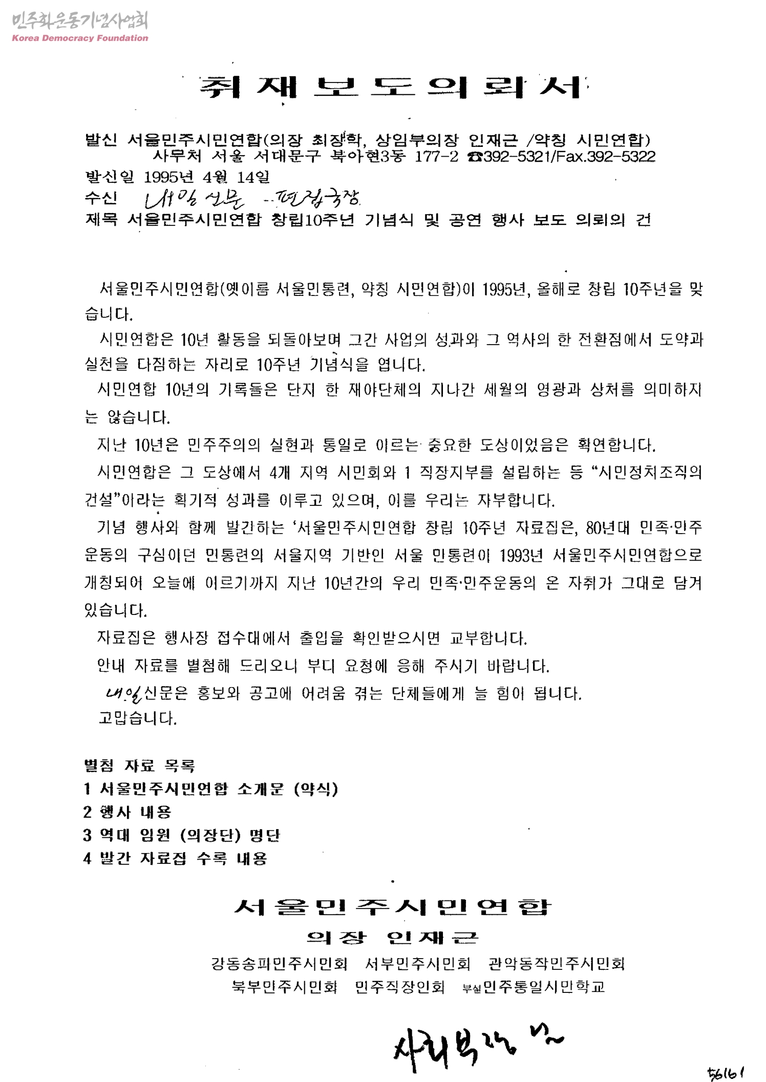 서울민주시민연합 창립10주년 기념식 및 공연 행사 보도 의뢰의 건