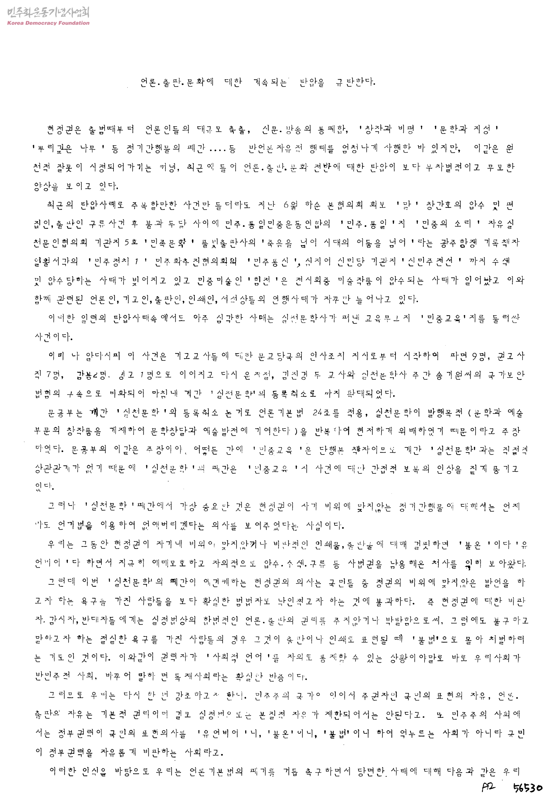 언론.출판.문화에 대한 계속되는 탄압을 규탄한다[실천문학의 등록 승인 및 언론인, 기고인, 출판인, 인쇄인, 서적의 압수 수행중지 요구]