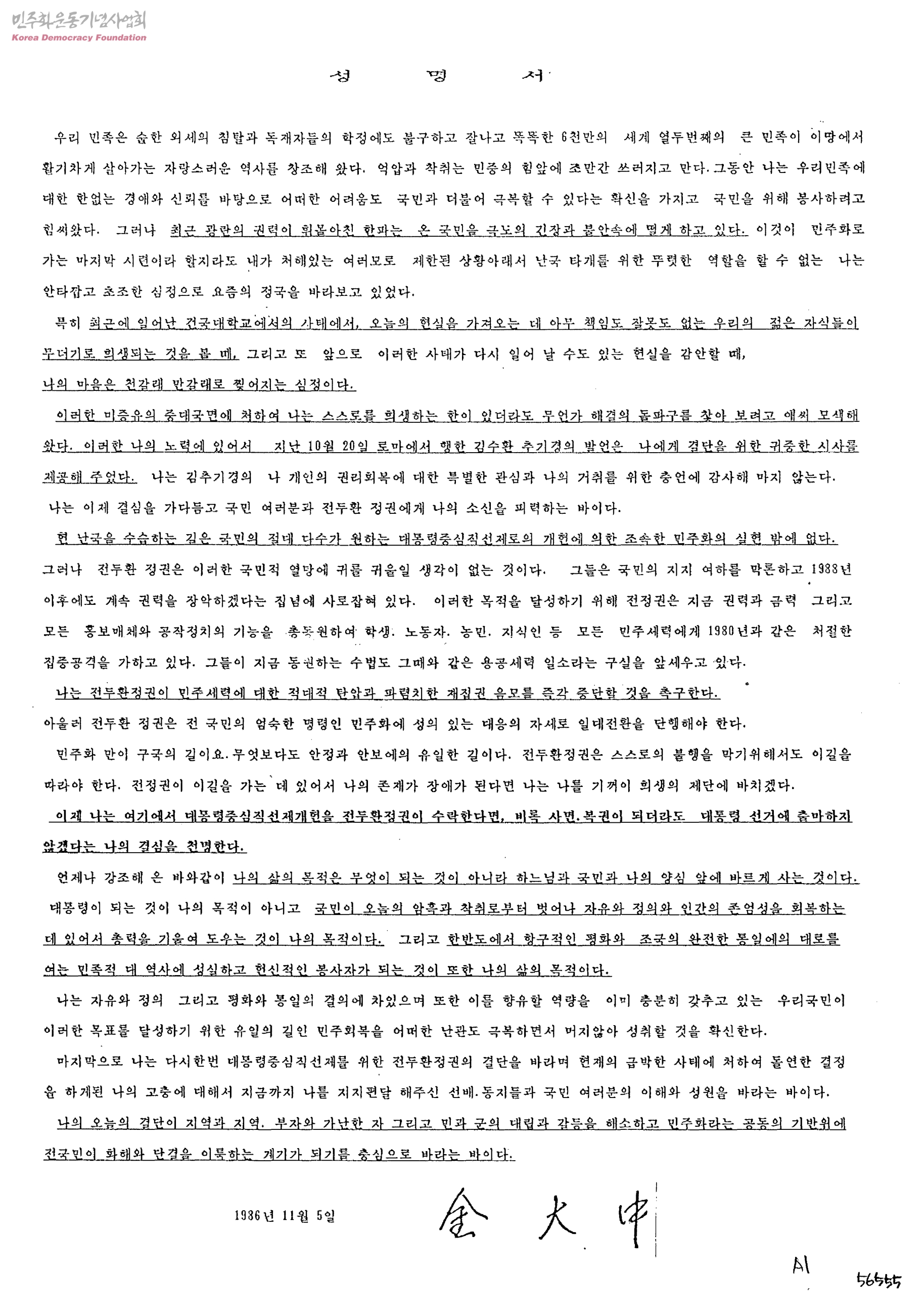 성명서[전두환정권의 민주세력탄압중지 및 대통령직선제로의 개헌 촉구]