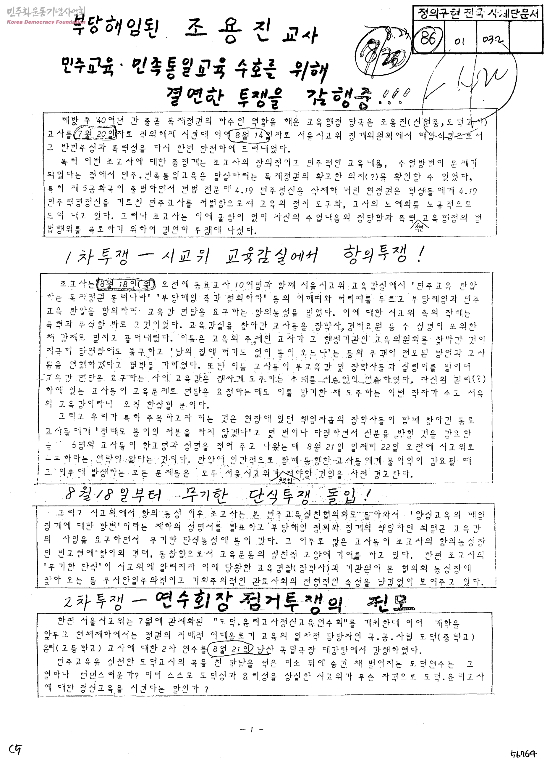 부당해임된 조용진 교사 민주교육ㆍ민족통일교육 수호를 위해 결연한 투쟁을 감행중
