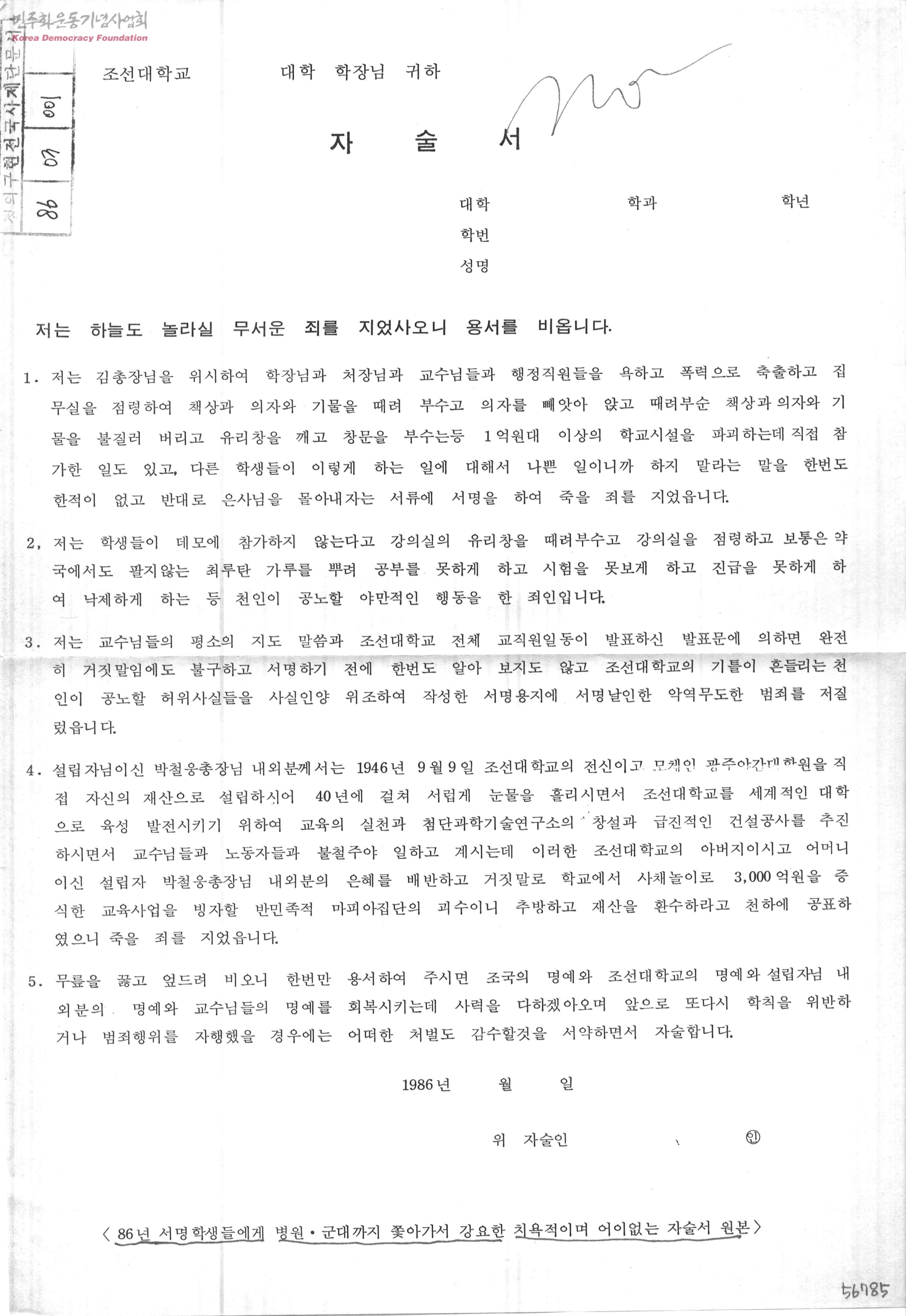 - 박철웅 총장의 비리 폭로 및 사퇴 요구 서명용지에 서명날인한 사실에 대한 '조선대학교 학장님 귀하. 저는 하늘도 놀라실 무서운 죄를 지었사오니 용서를 비옵니다.'로 시작하는 자술서 양식