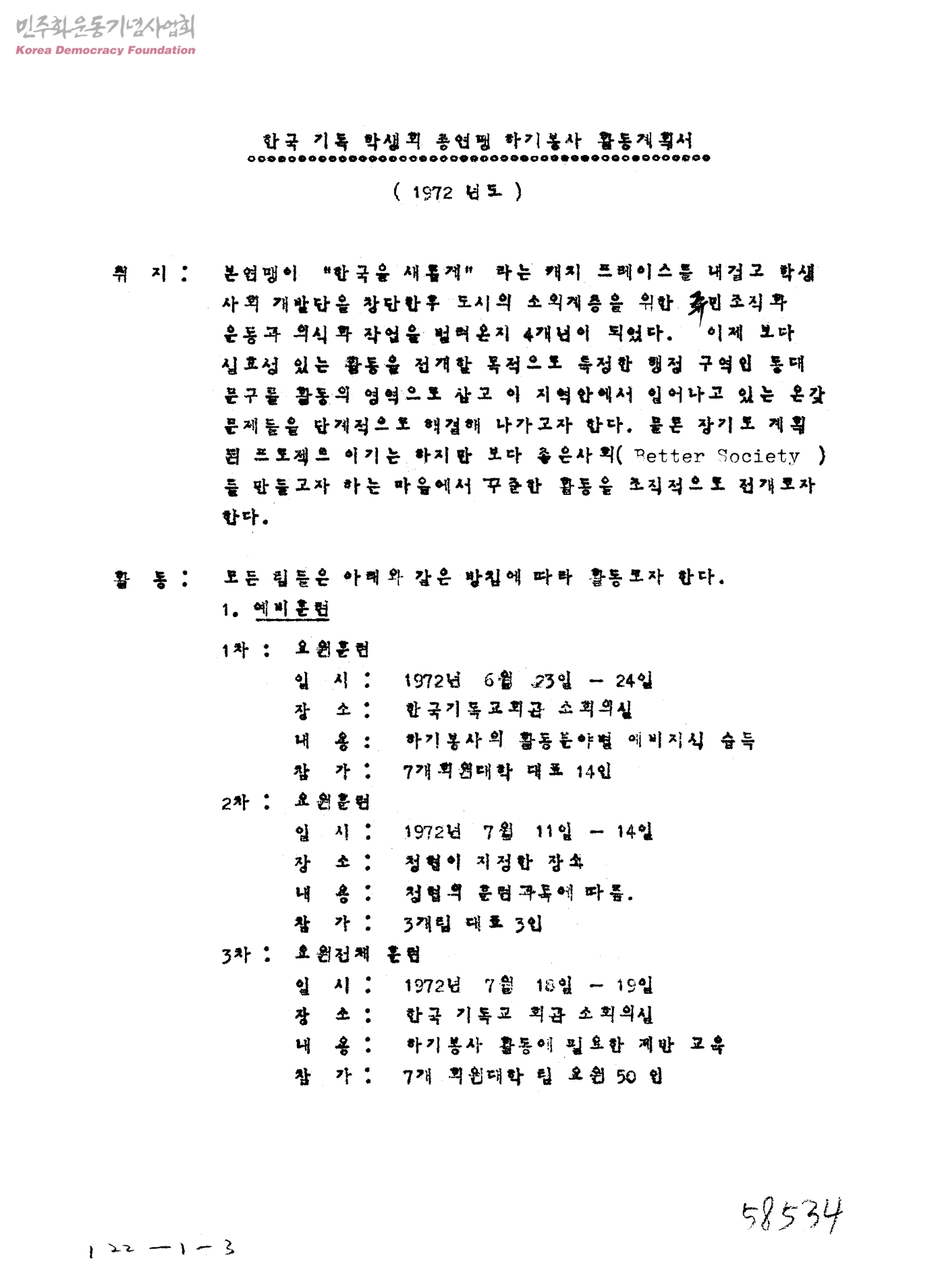 한국 기독 학생회 총연맹 하기봉사 활동계획서(1972년도)