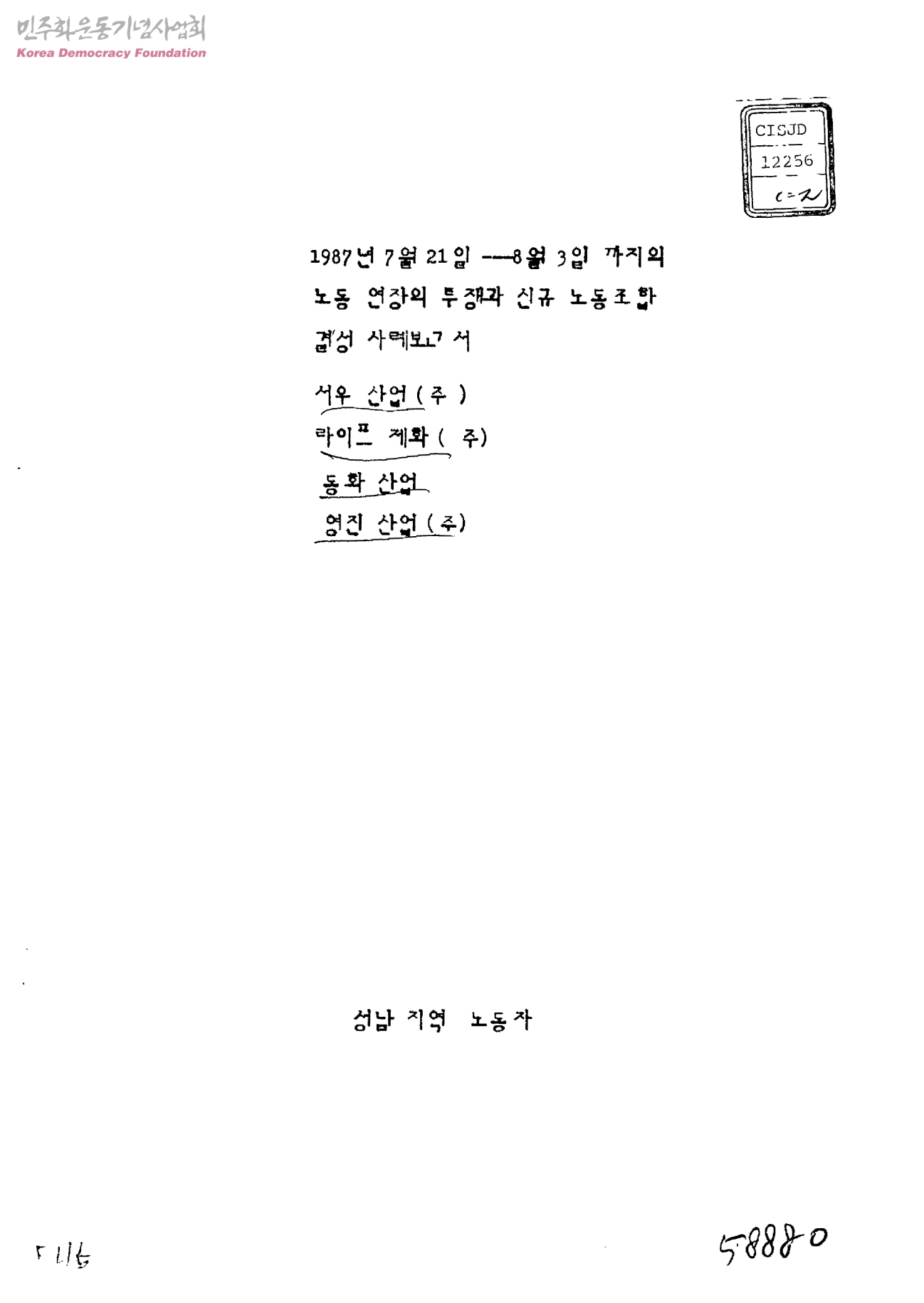 1987년 7월 21일-8월 3일까지의 노동 연장의 투쟁과 신규 노동조합 결성 사례보고서-서우산업㈜, 라이프 제화㈜, 동화산업, 영진산업㈜