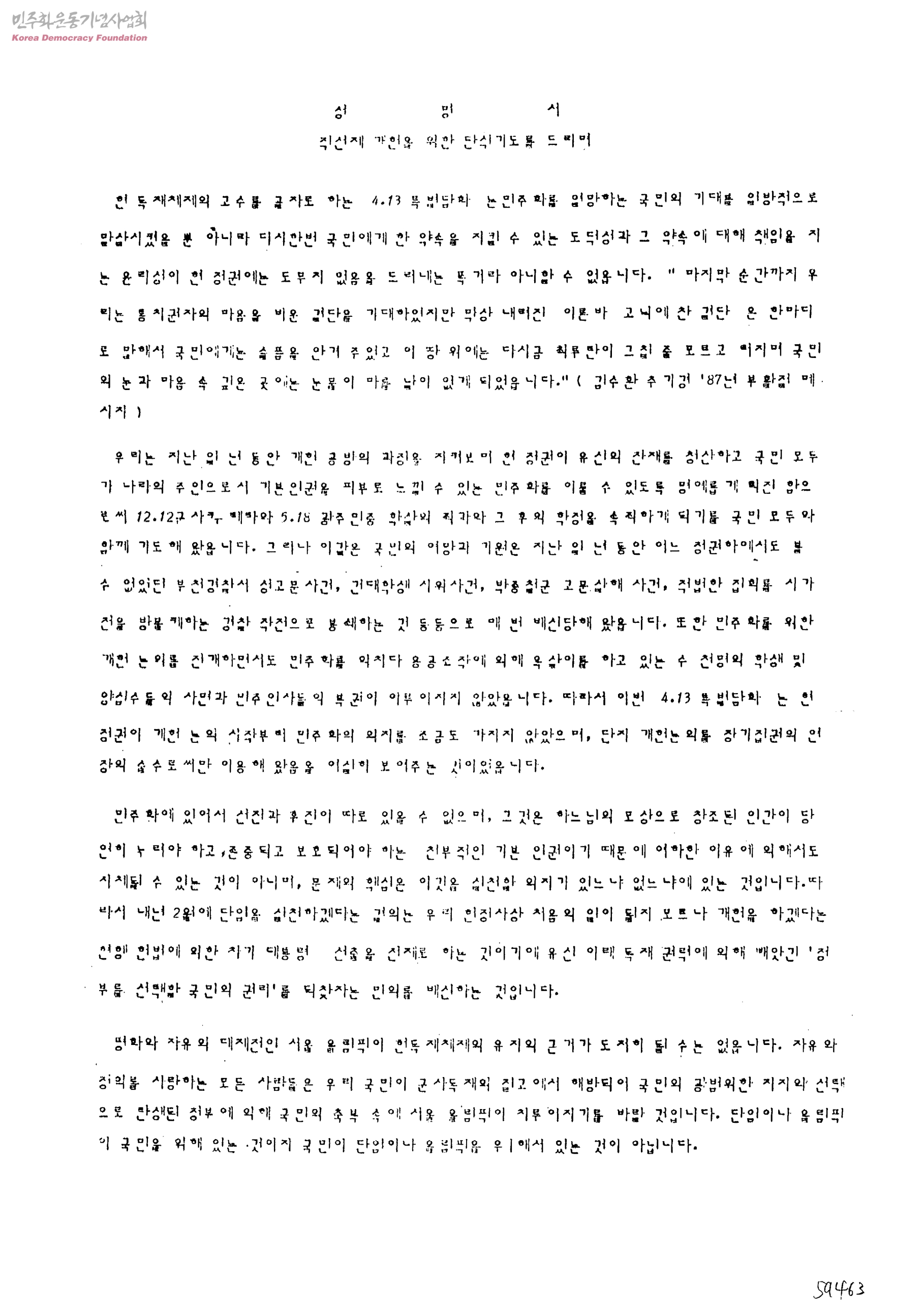 성명서-직선제 개헌을 위한 단식기도를 드리며