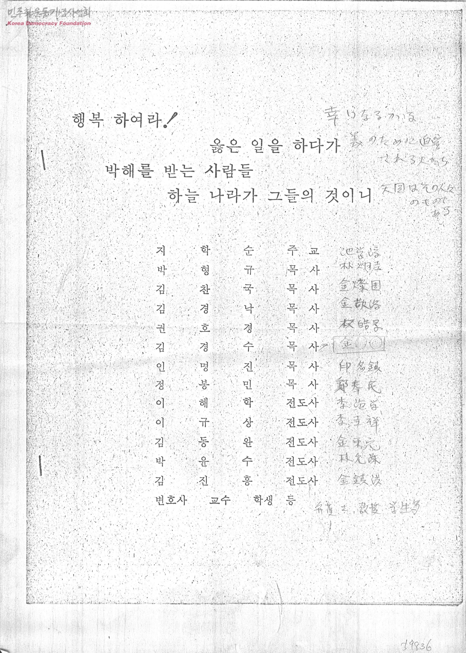 행복하여라! 옳은 일을 하다가 박해를 받는 사람들 하늘나라가 그들의 것이니[민청학련 사건 관련 양심선언 및 성명서 등]