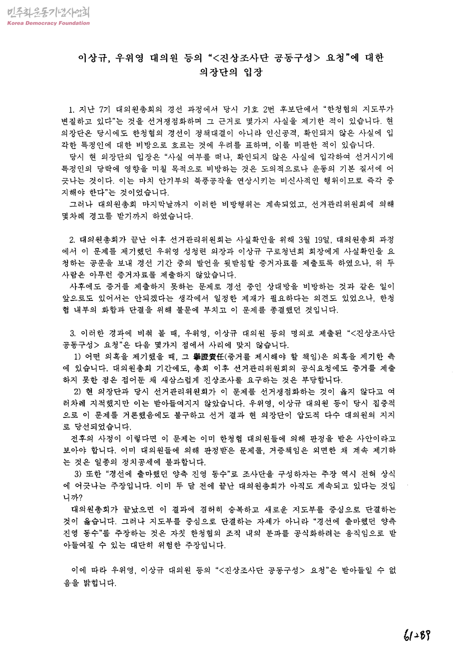 이상규, 우위영 대의원 등의 <진상조사단 공동구성> 요청에 대한 의장단의 입장