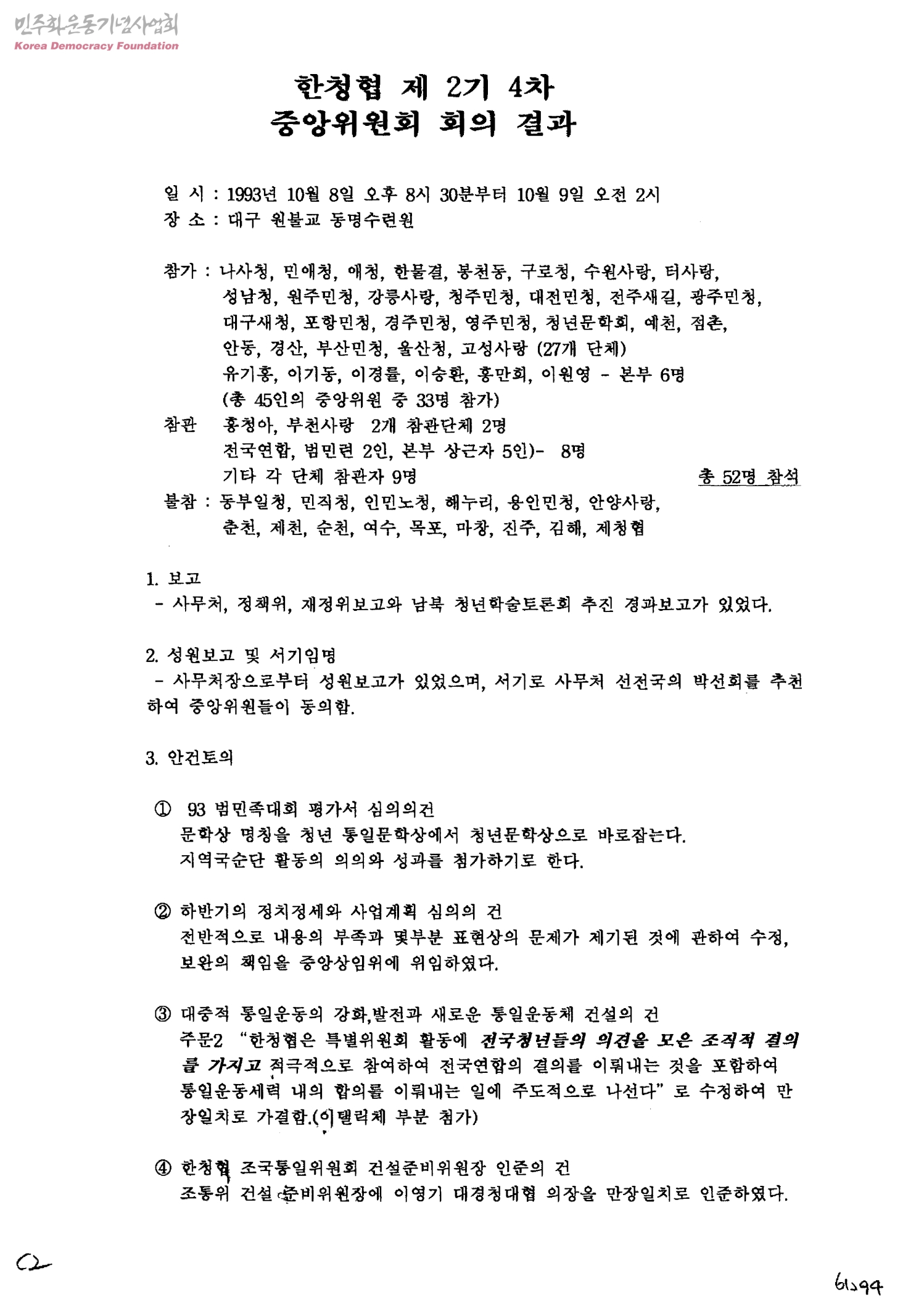 한국민주청년단체협의회 제2기 4차 중앙위원회 회의 결과