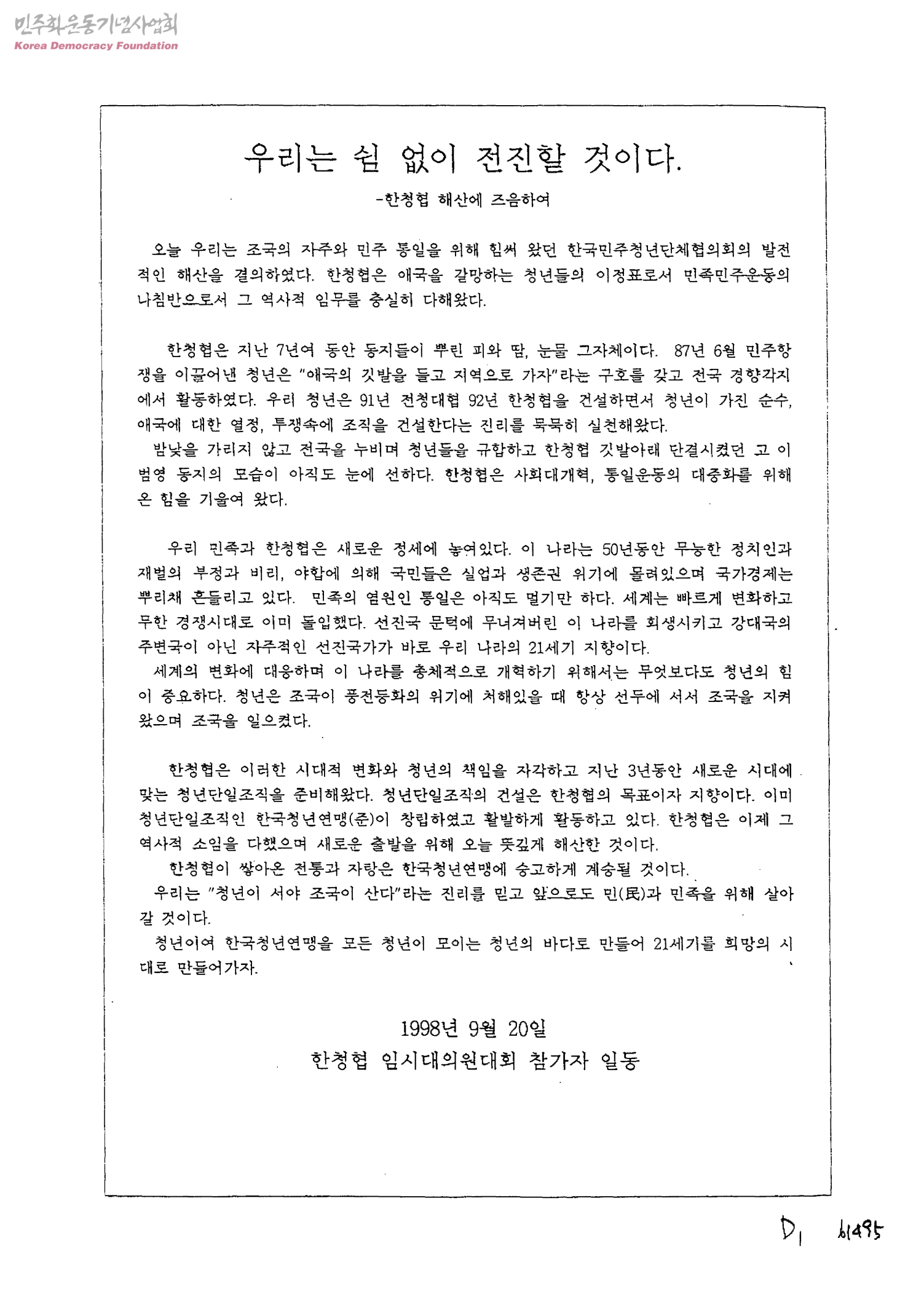 우리는 쉼 없이 전진할 것이다-한청협 해산에 즈음하여