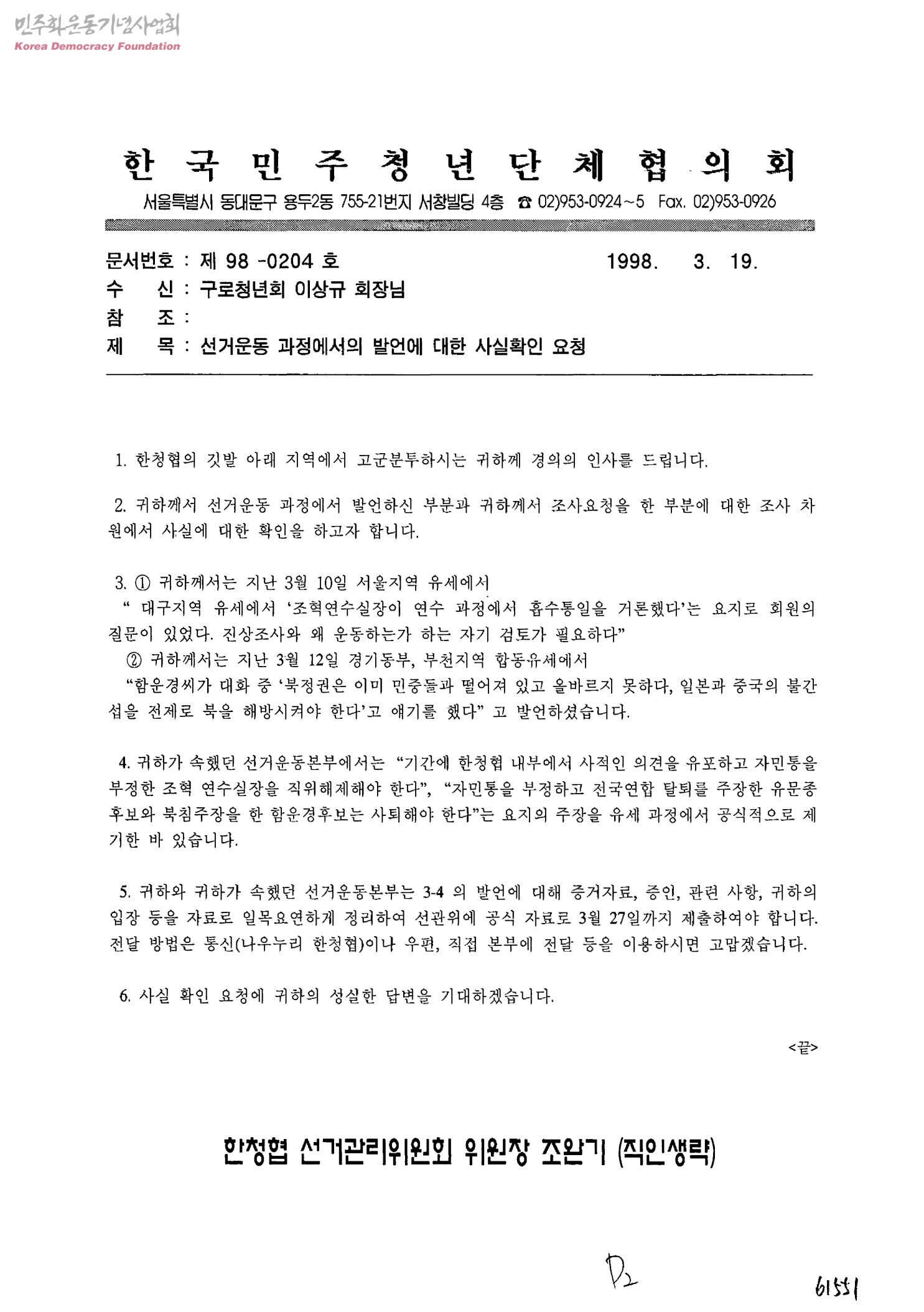 선거운동 과정에서의 발언에 대한 사실확인 요청[수신:구로청년회회장 이상규, 발신:한국민주청년단체협의회선거관리위원회]