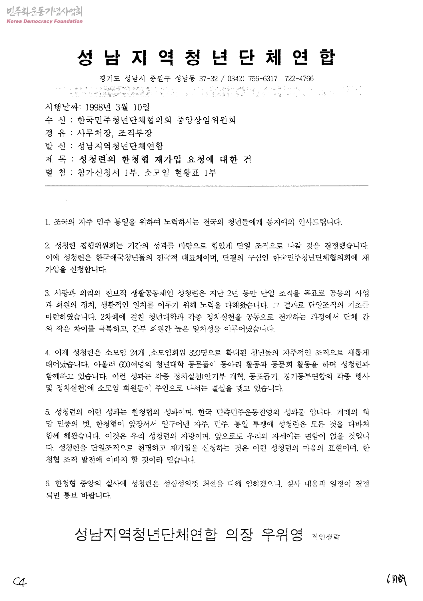 성청련의 한청협 재가입 요청에 대한 건[수신:한국민주청년단체협의회 중앙상임위원회, 발신:성남지역청년단체연합]
