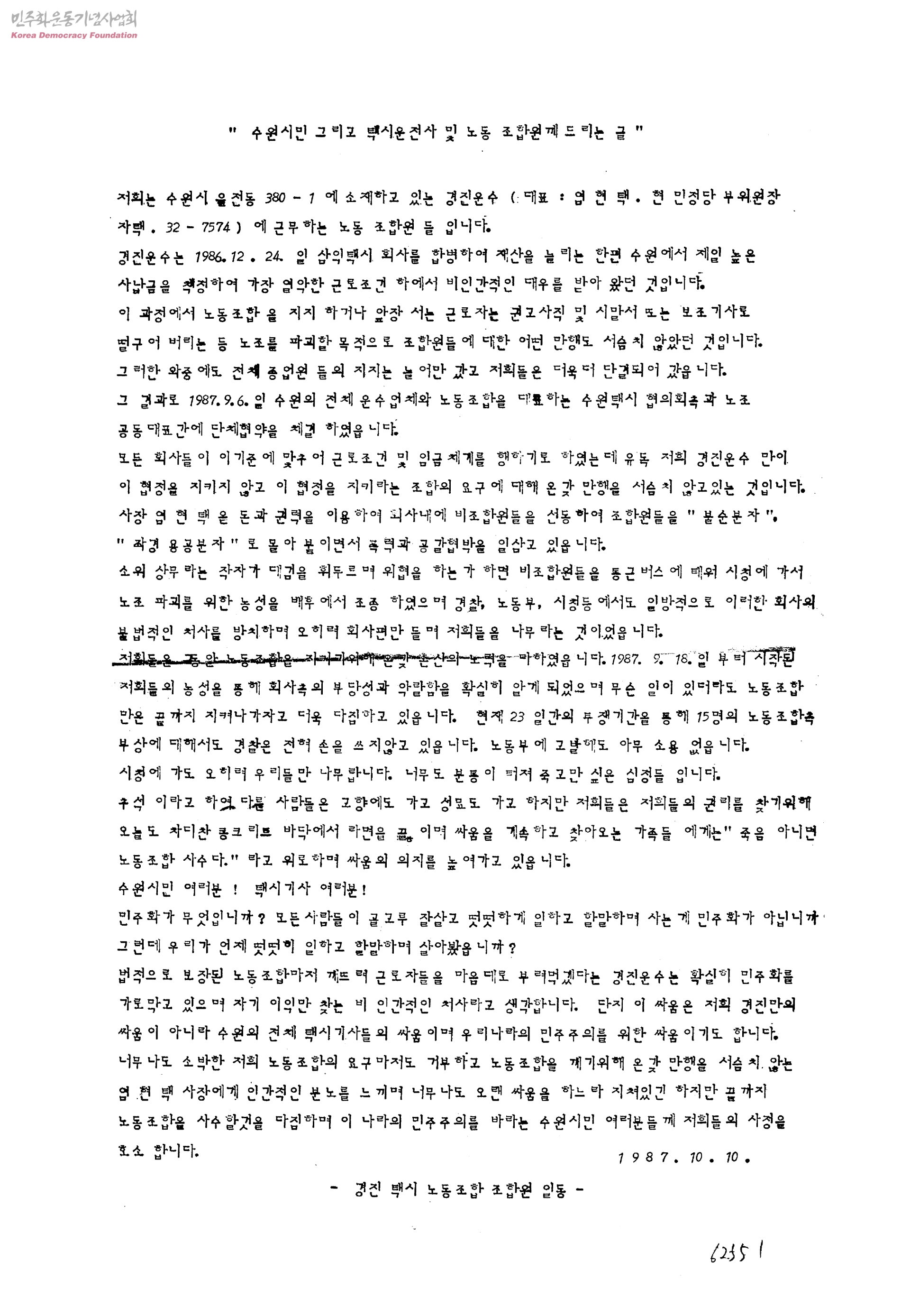 수원시민 그리고 택시운전사 및 노동조합원께 드리는 글