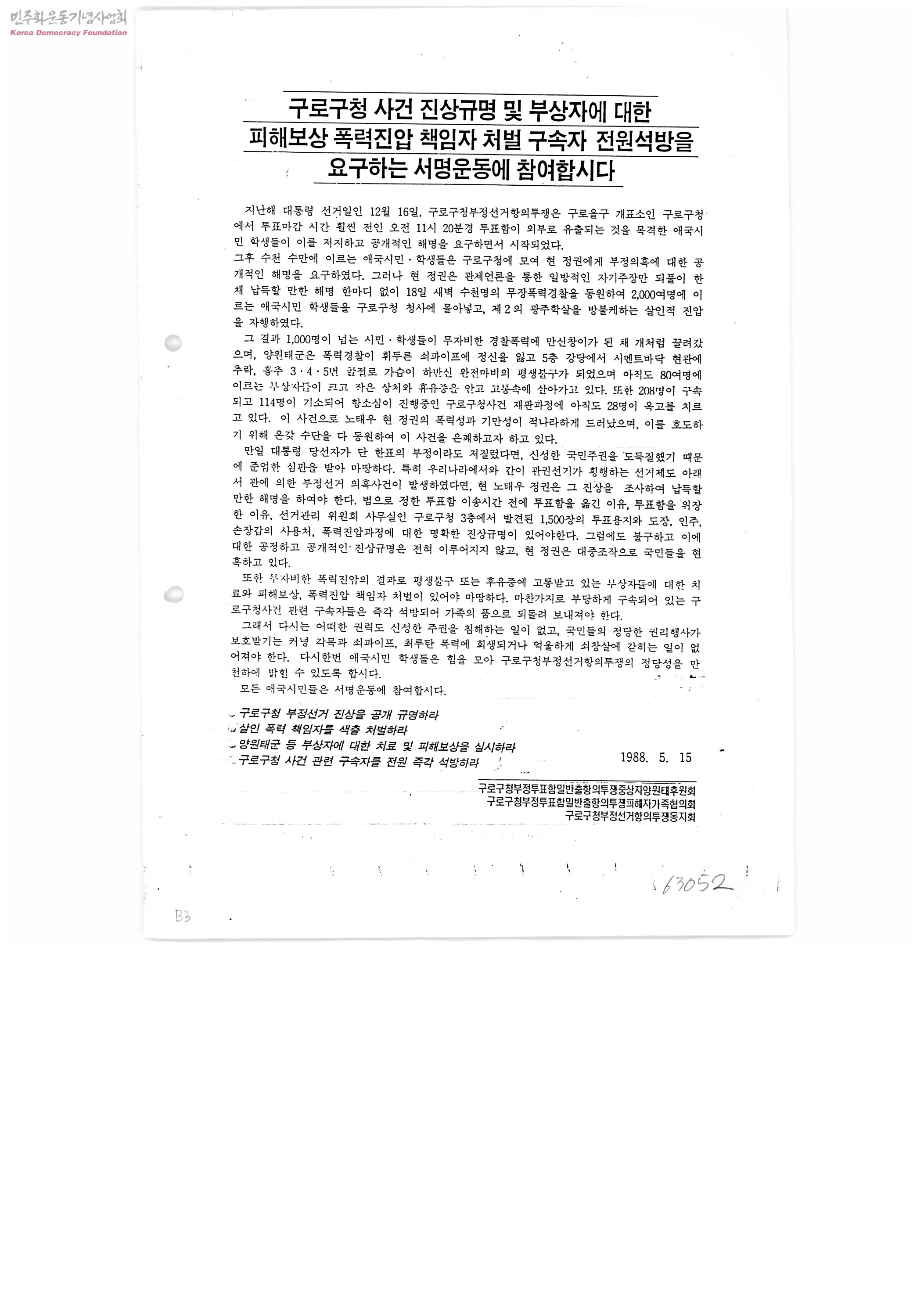 구로구청 사건 진상규명 및 부상자에 대한 피해보상 폭력진압 책임자처벌 구속자 전원석방을 요구하는 서명운동에 참여합시다
