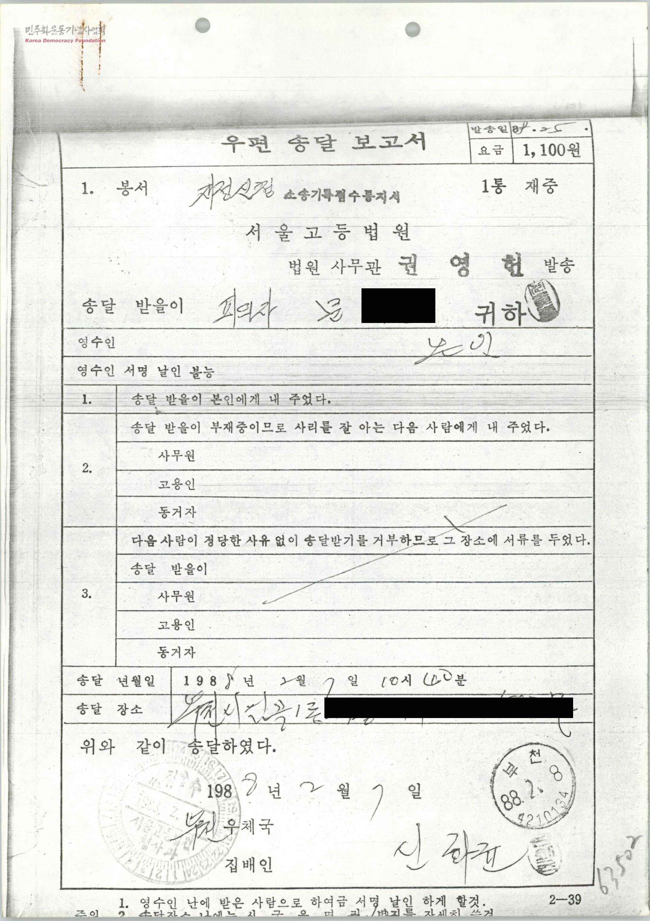 우편 송달 보고서-재정신청 소송기록접수통지서 재중