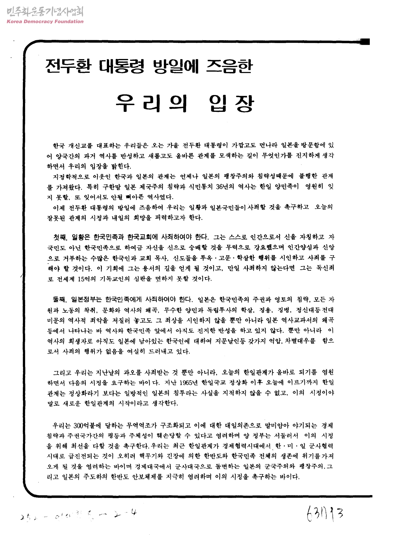 전두환 대통령 방일에 즈음한 우리의 입장