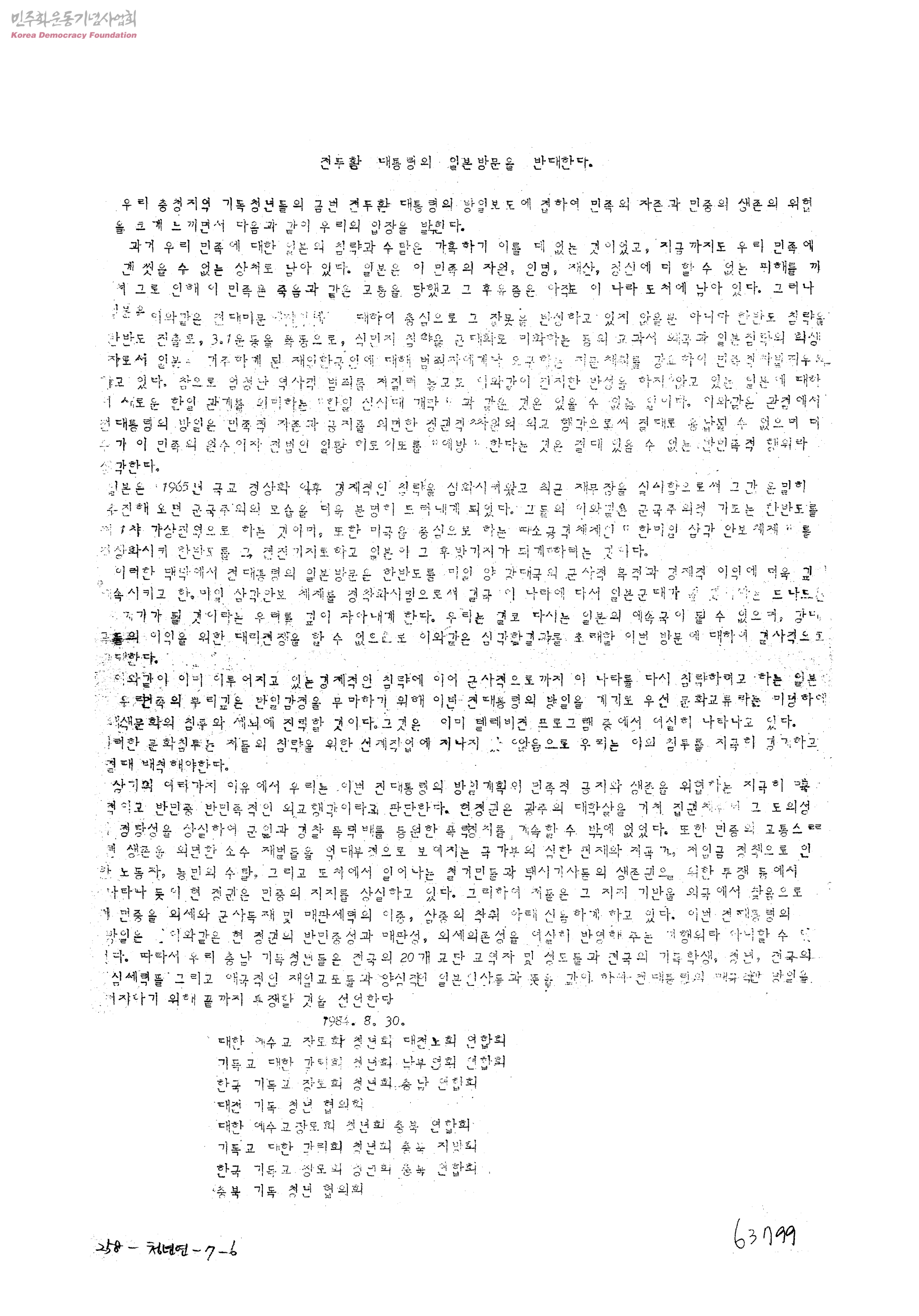 전두환 대통령의 일본방문을 반대한다.