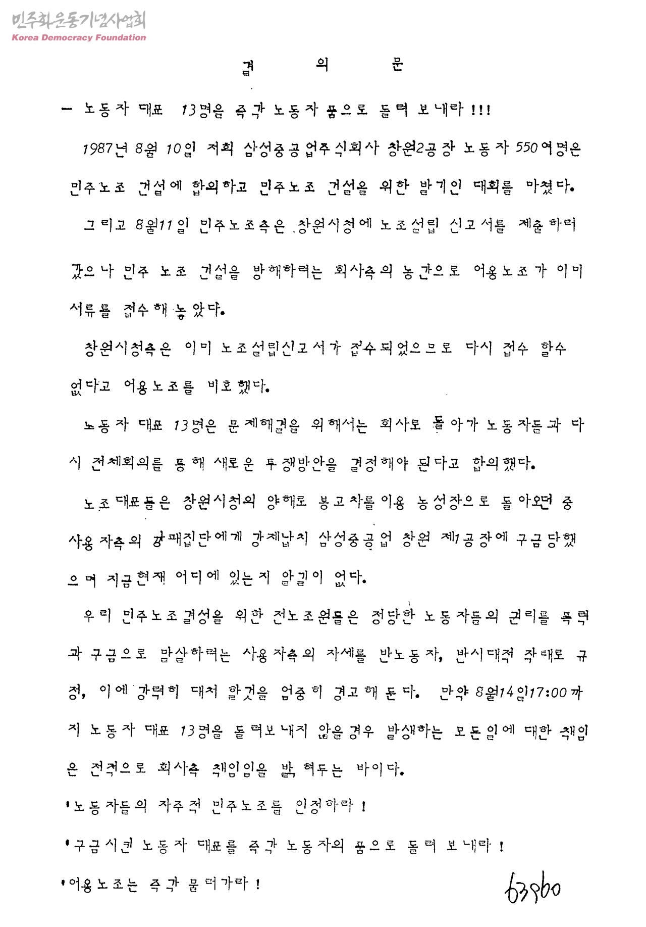 결의문-노동자 대표 13명을 즉각노동자 품으로 돌려보내라!!
