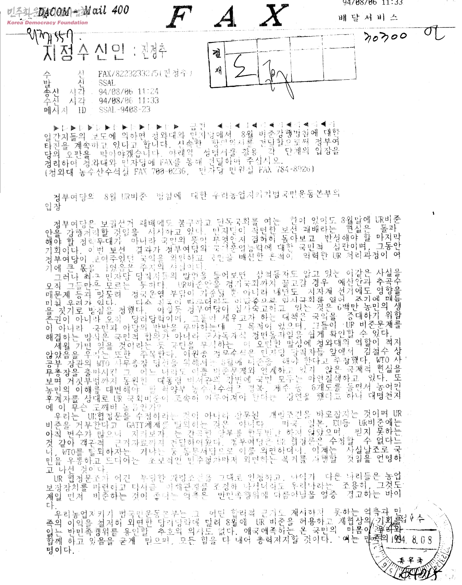 정부여당의 8월 UR비준 방침에 대한 우리농업지키기범국민운동본부의 입장