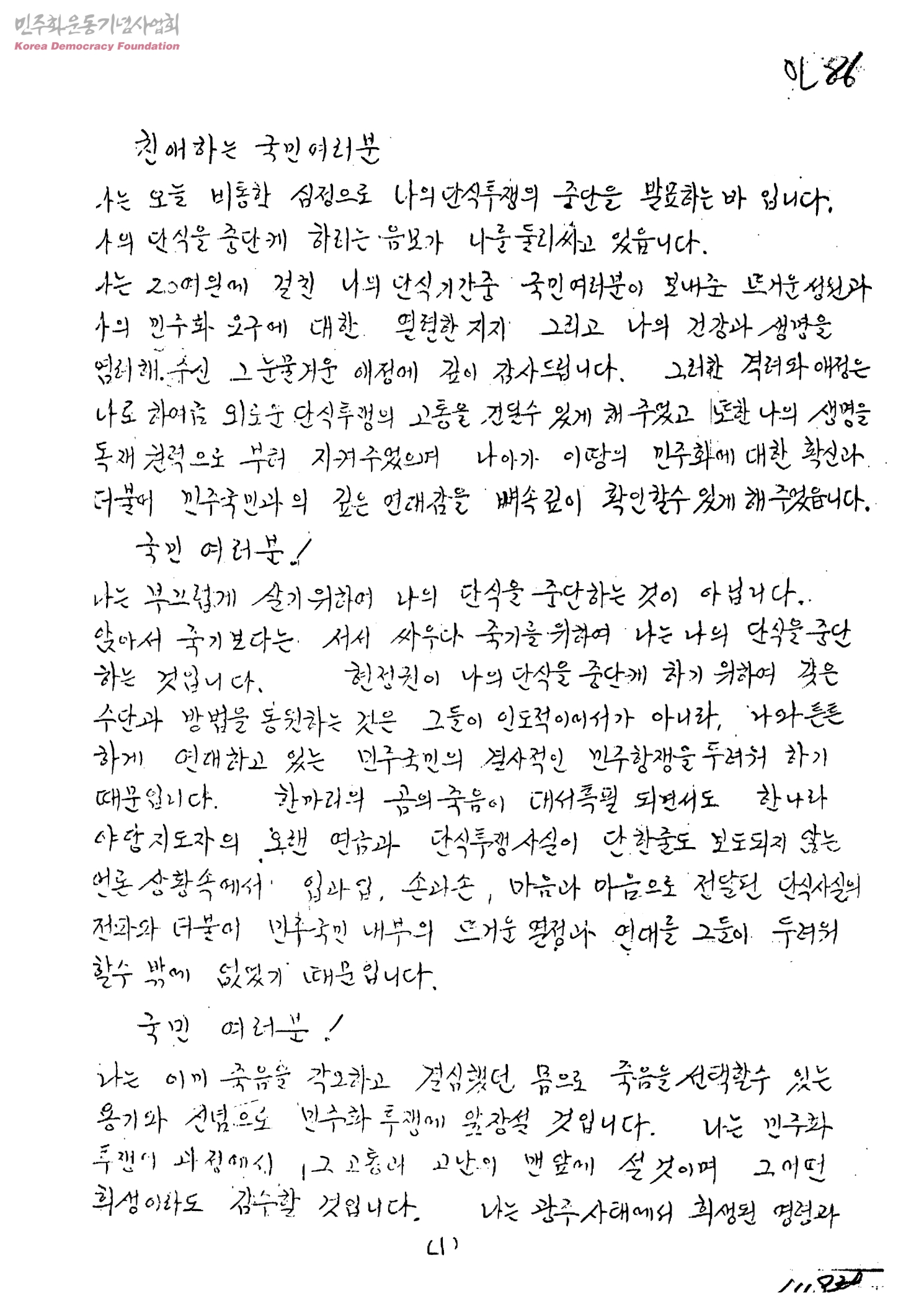 - 단신투쟁의 중단 발표와 민주화 투쟁에 대한 결심