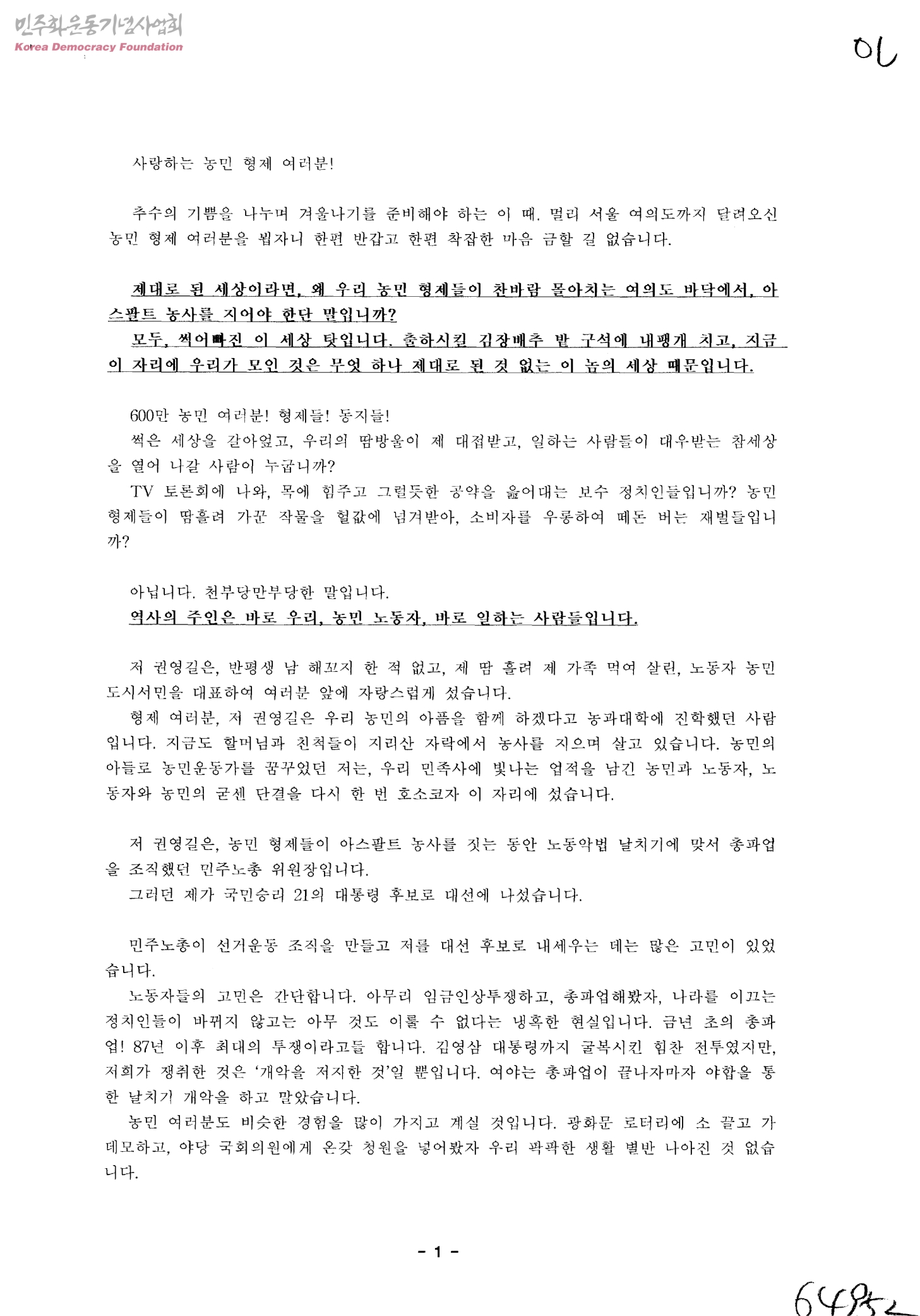 [권영길이 농민들에게 쓰는 지지요청관련 편지]