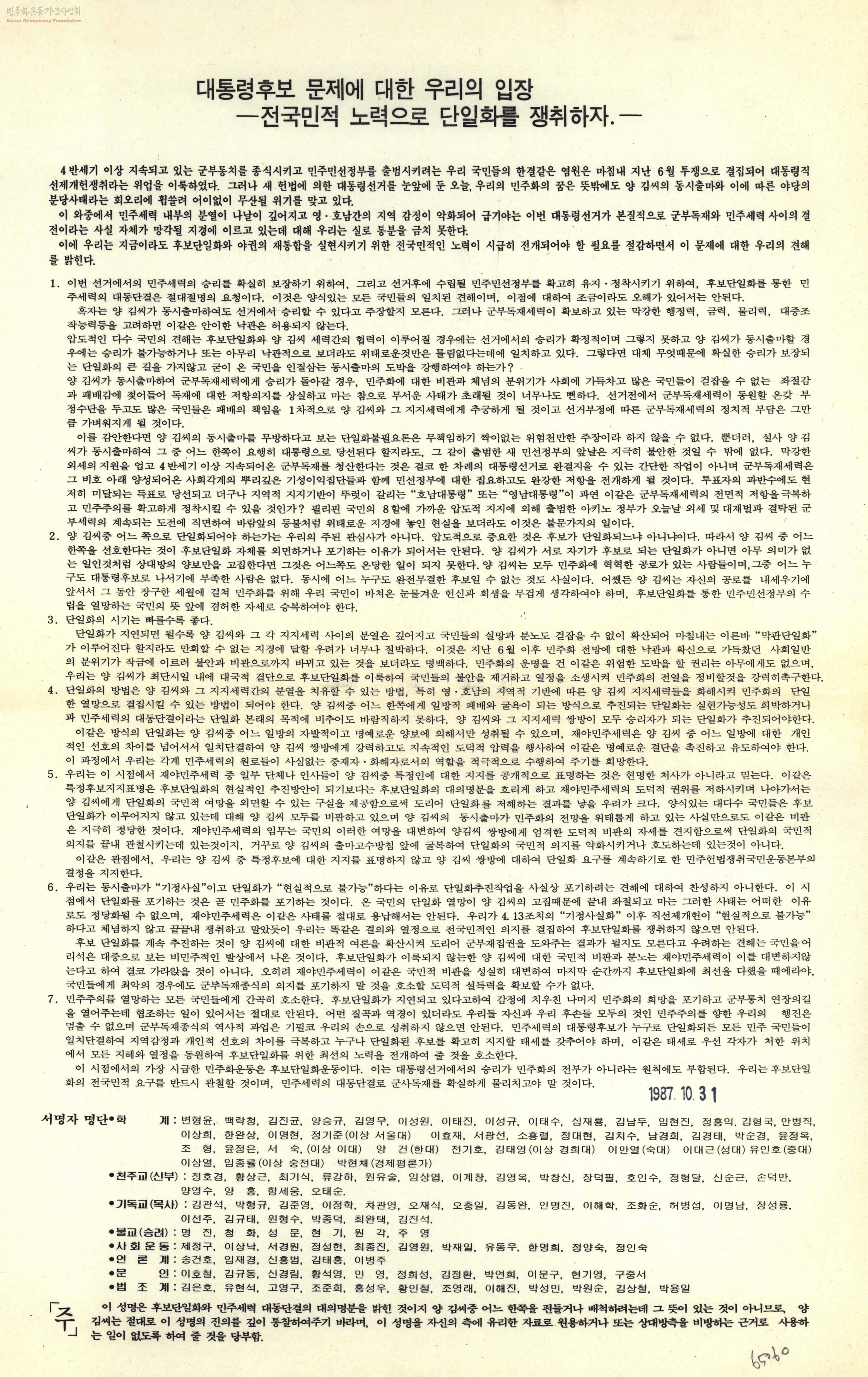 - 대통령후보 문제에 대한 우리의 입장-전국민적 노력으로 단일화를 쟁취하자 서명자명단-학계, 천주교(신부), 기독교(목사), 불교(승려),사회운동, 언론계, 문인, 범조계