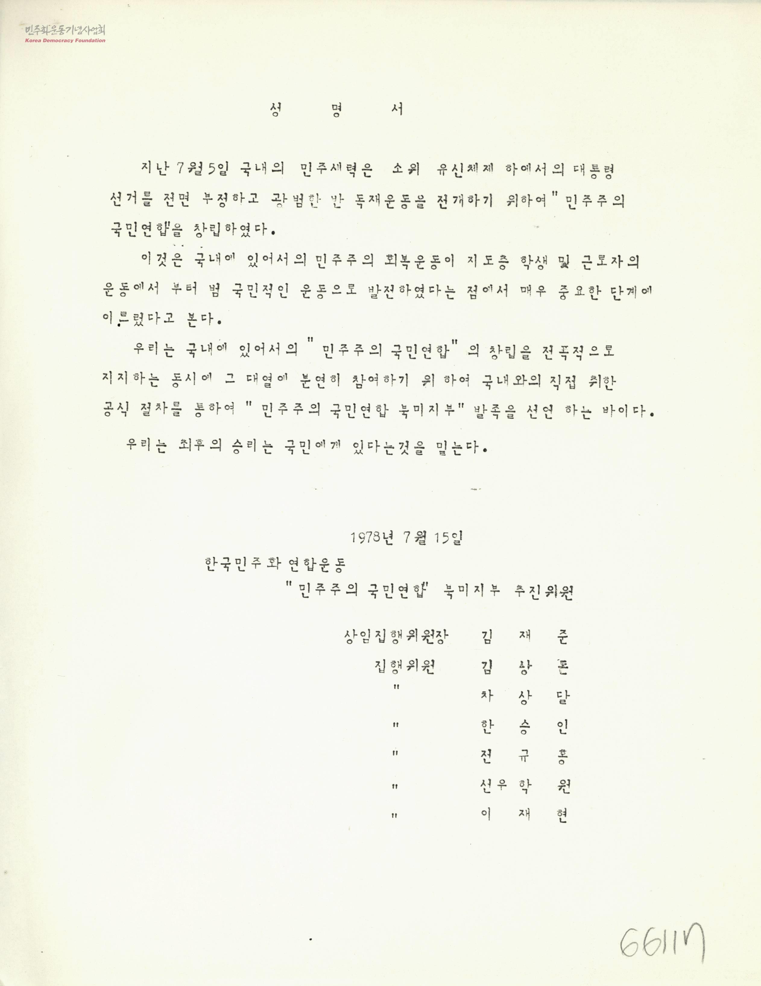 성명서[민주주의 국민연합 북미지부 발족 선언]