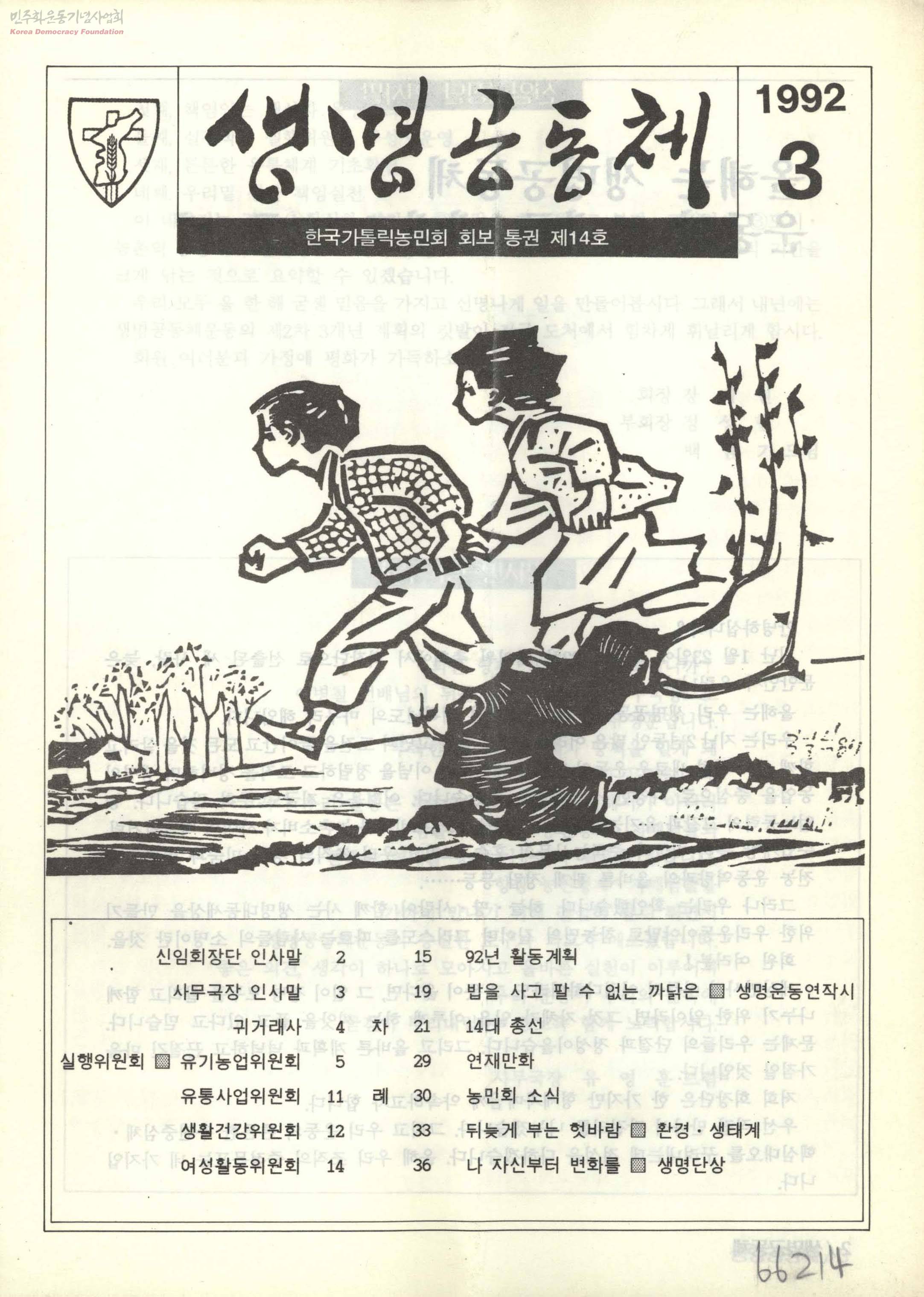 - 농민 스스로의 단결과 협력으로, 농민의 권익을 옹호하고, 인간적 발전을 도모하며, 사회정의 실현을 통한 농촌사회의 복음화와 인류공동체 발전에 기여함을 목적으로 1966년 창립된 천주교 농민운동단체로써 민주화와 인권신장에 크게 기여한 한국가톨릭농민회의 회보. 신임회장단 인사말 사무국장 인사말 귀거래사 실행위원회 92년 활동계획 등.