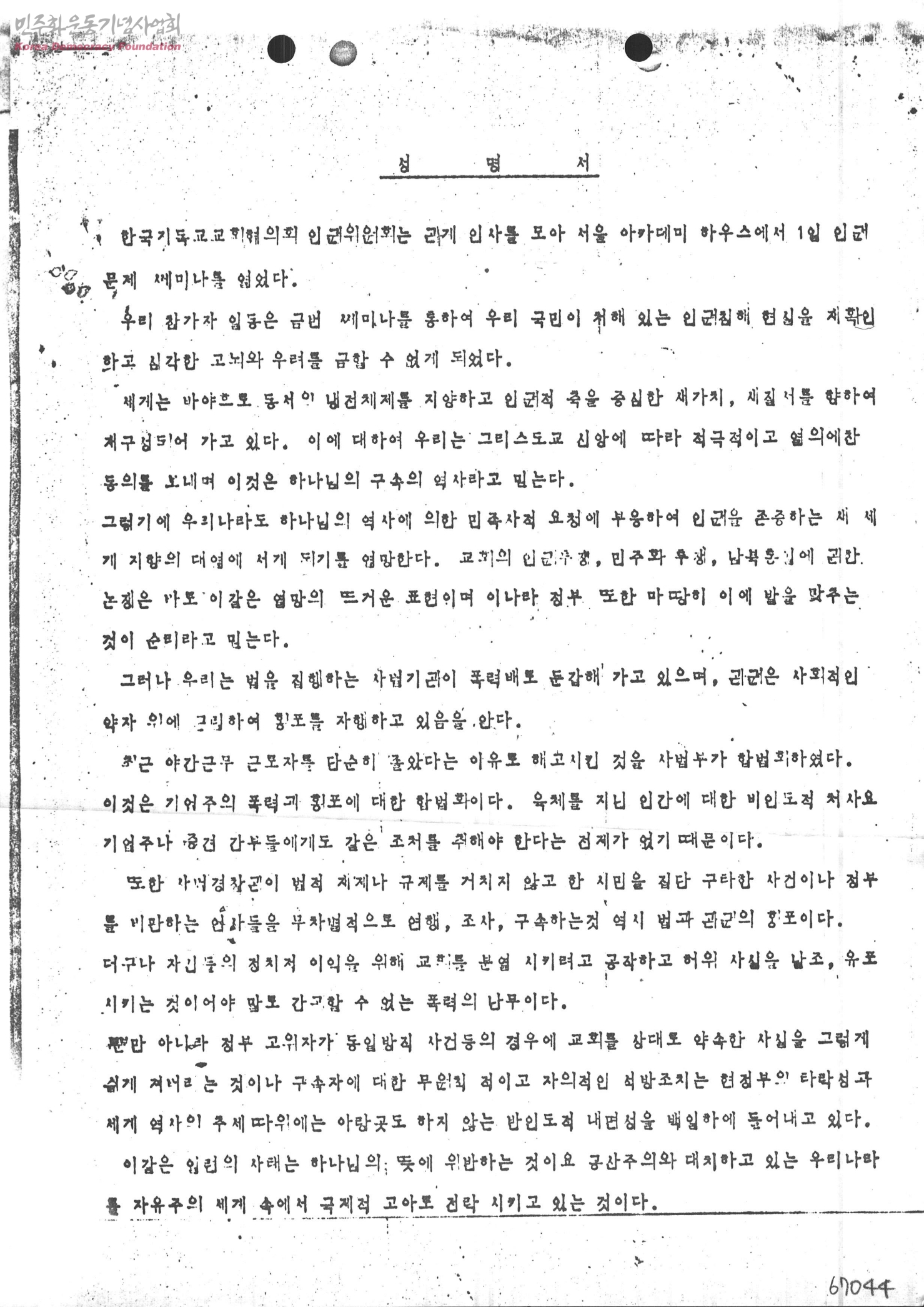 - 4월 1일 아카데미하우스에서 열린 "인권문제 쎄미나"를 통하여 우리 국민이 처해 있는 인권침해 현실을 재확인하고 당국의 시정과 회개를 촉구하는 바이다. 당국은 유신헌법 발효이후 구속한 애국학생, 양심적 민주인사 전원을 무조건 석방하라.